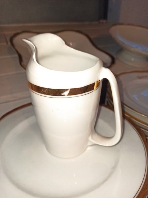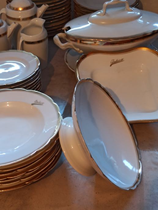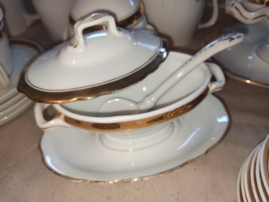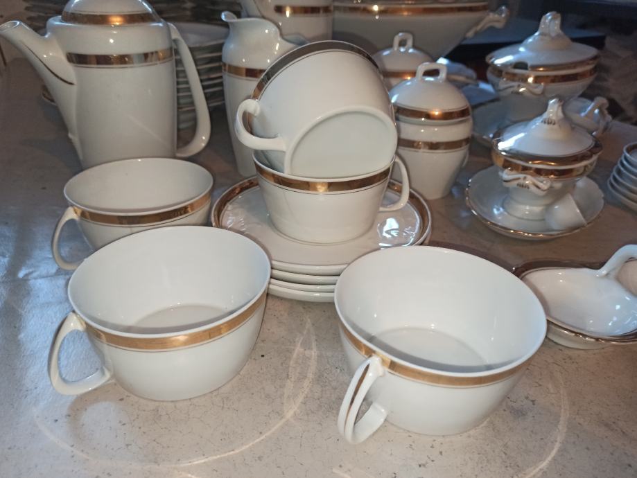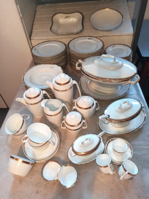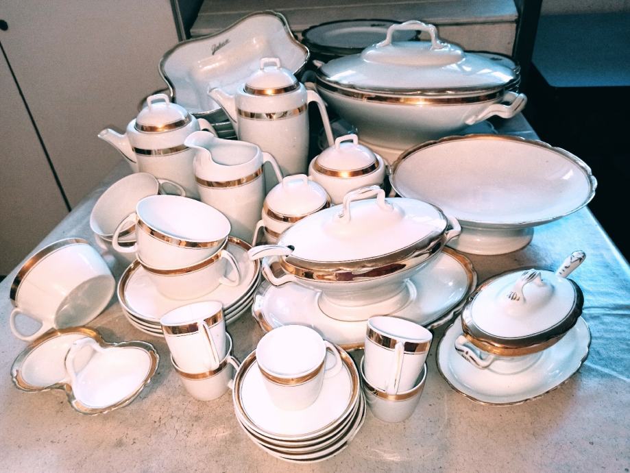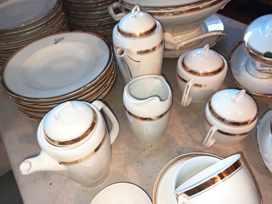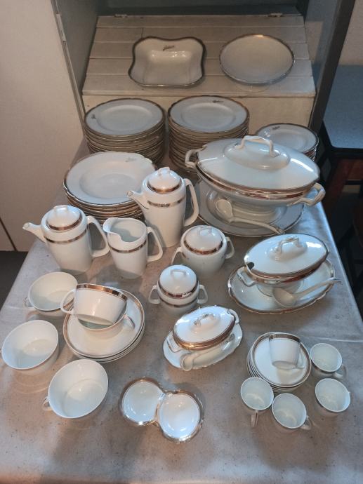 Ima čak 23 plitka velika tanjura, 9 dubokih i 9 malih tanjurića. Svi ostali dijelovi kao što se vidi na slici, zajedno