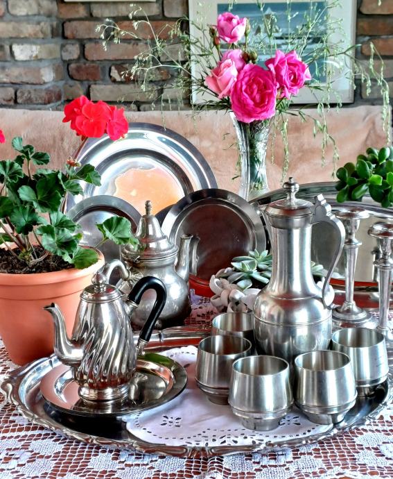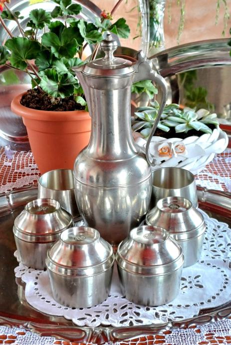 Izuzetno lijep vintage Selangor Royal servis za čaj ili kavu. Visina čaša 7 cm, promjer otvora 7 cm. Zapremina vrča cca 1 litra. Luksuzni brend , kositra čistoće 97%. Na zadnjim slikama su cijene na ino tržištu. Obiteljsko nasljeđe, postaje višak zbog selidbe.