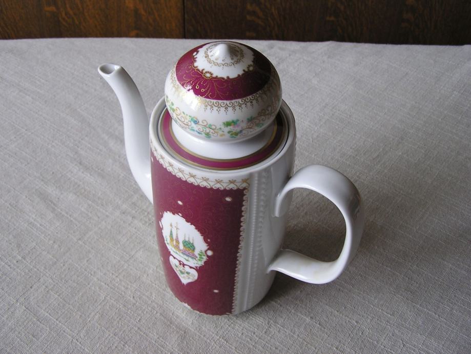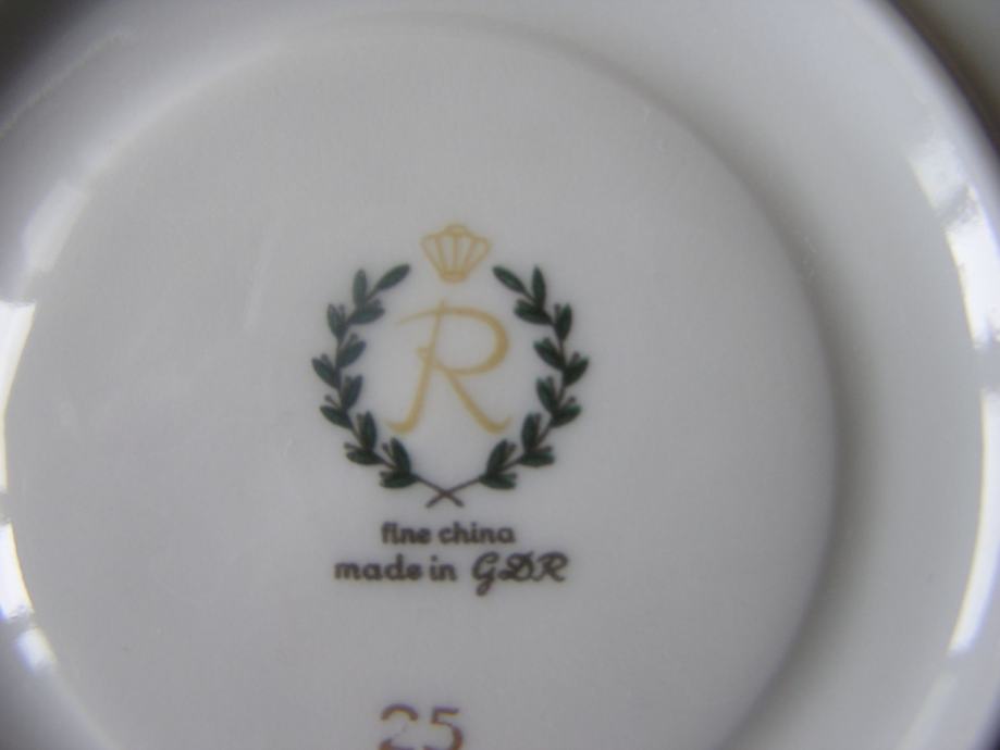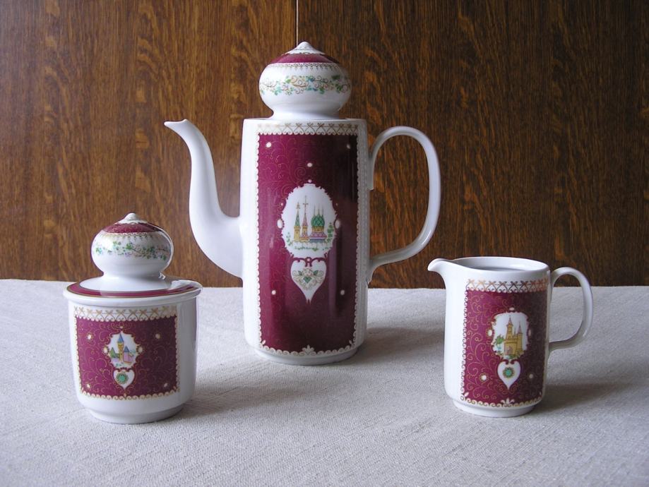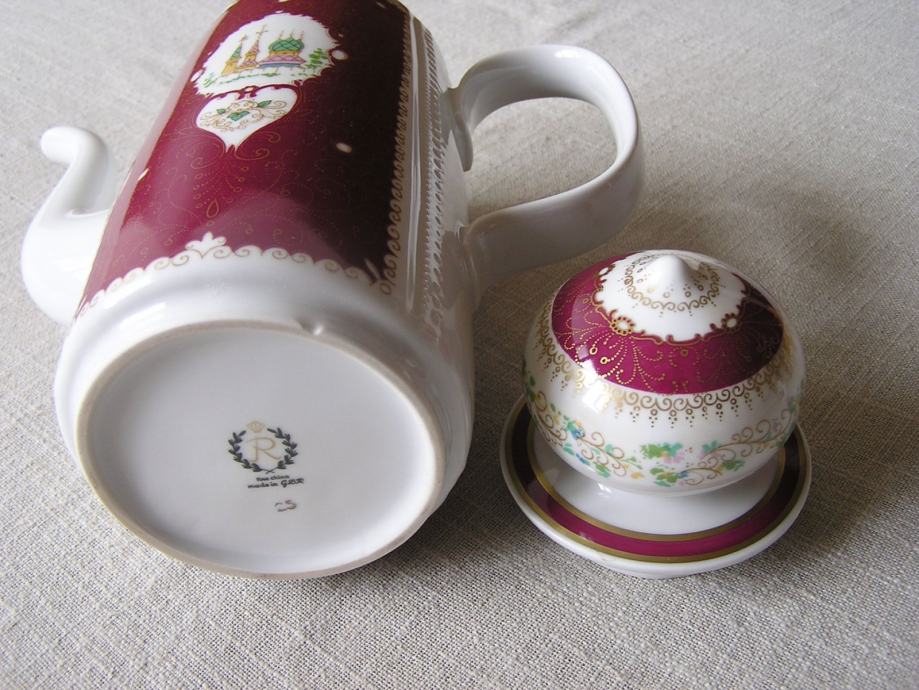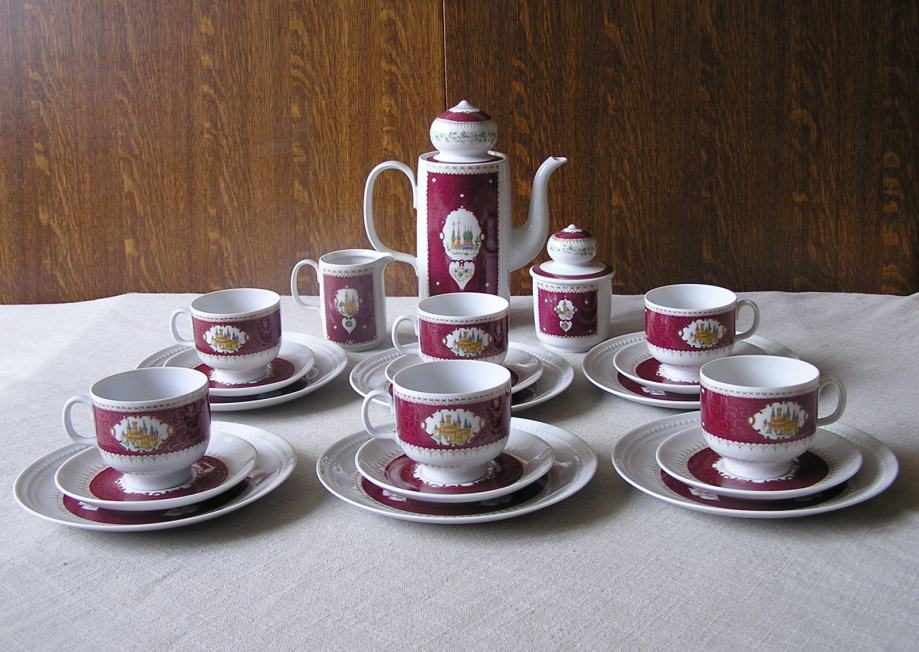 Servis se sastoji od 21 dijela: čajnik, šećernica, vrčić za mlijeko, 6 desertnih tanjura, 6 šalica i 6 malih tanjurića za šalice. Dizajn je inspiriran knjigom s arapskim pričama "Tisuću i jedna noć" i rijetko se može naći. Njemački porculan, Reichenbach iz perioda 1968. - 1990. Sve je u odličnom stanju, kao da nije korišteno, jedino čajnik ima jedno oštećenje na donjem rubu i jedan zarez na poklopcu, oboje je vidljivo na zadnjoj slici