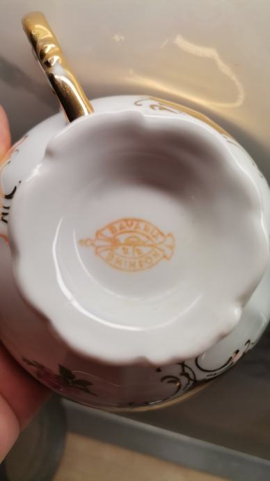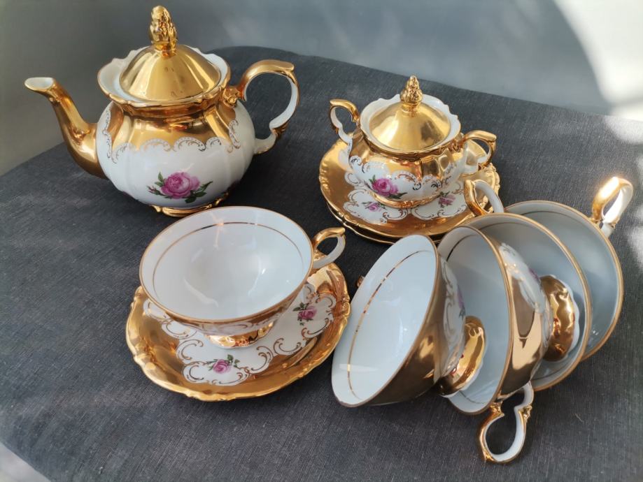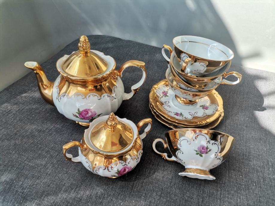 Pozlaćeni set :posuda za šećer,čajnik,šalice s tanjurićima,5 kom