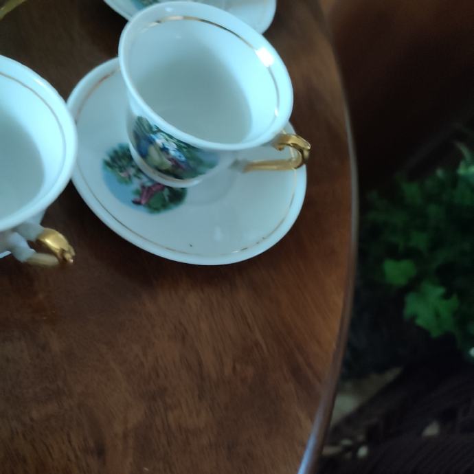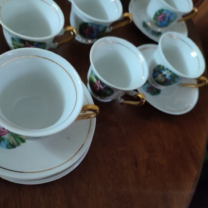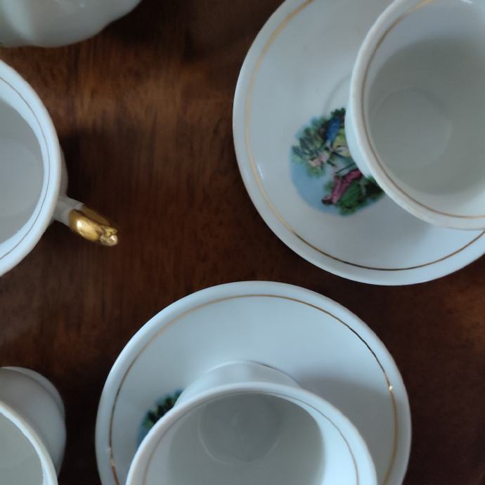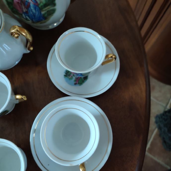 Zaljubljeni par, porculan Zaječar, servis za kavu, 6 šalica, 6 tanjurića, šećernica, vrč za kavu, sve sa zlatnim rubom, u besprijekornom stanju, nikada korišteno. Čuvano u kutiji, prodajem zbog selidbe u manji prostor.