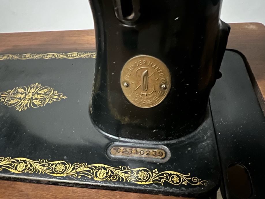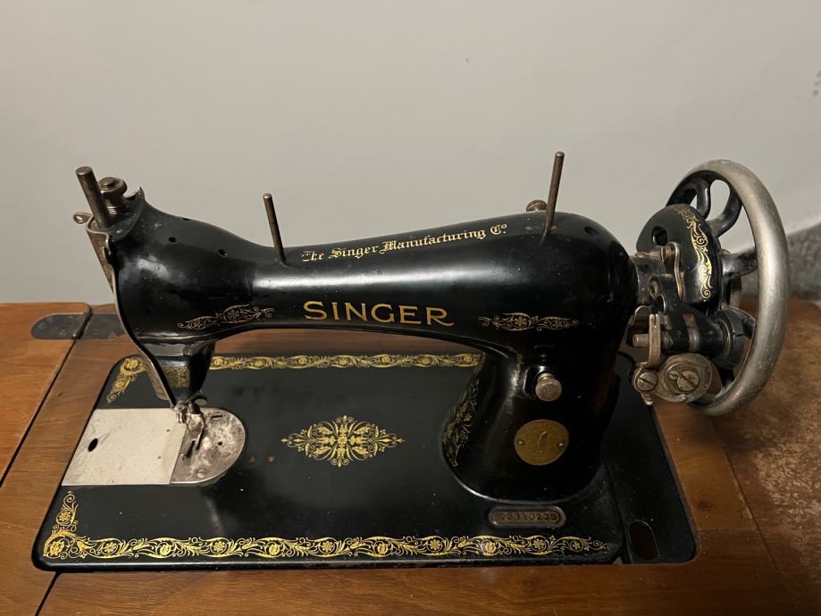 Singer šivaća mašina s postoljem. Serijski broj 2310239, proizvedena 1877.godine.
