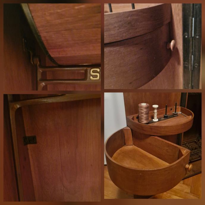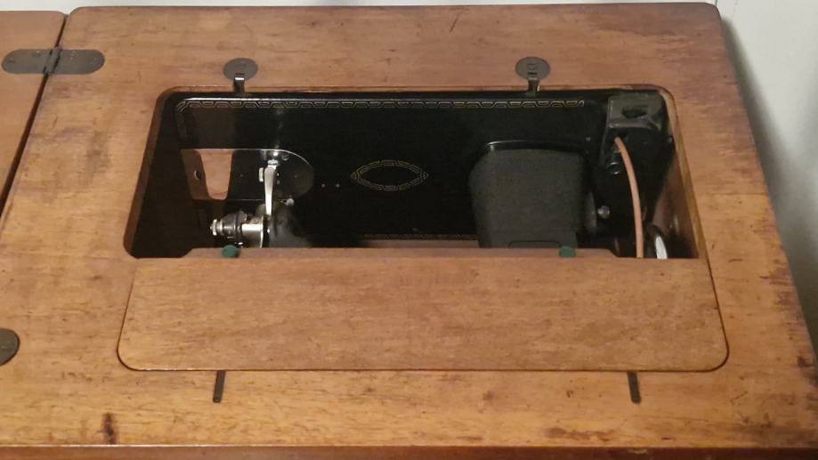 Ormarić u kojem se nalazi originalni je drveni kabinet (tip "Queen Anne" ili "treadle cabinet"), u kojem se mašina može spustiti i zatvoriti poput komode.