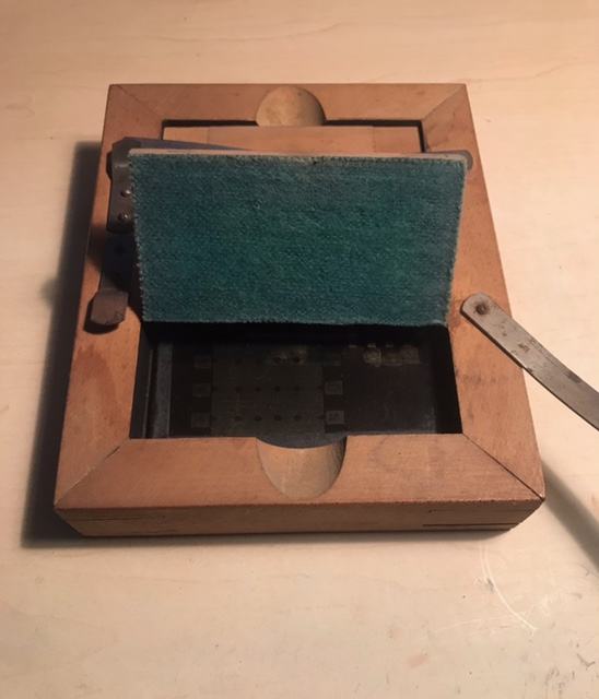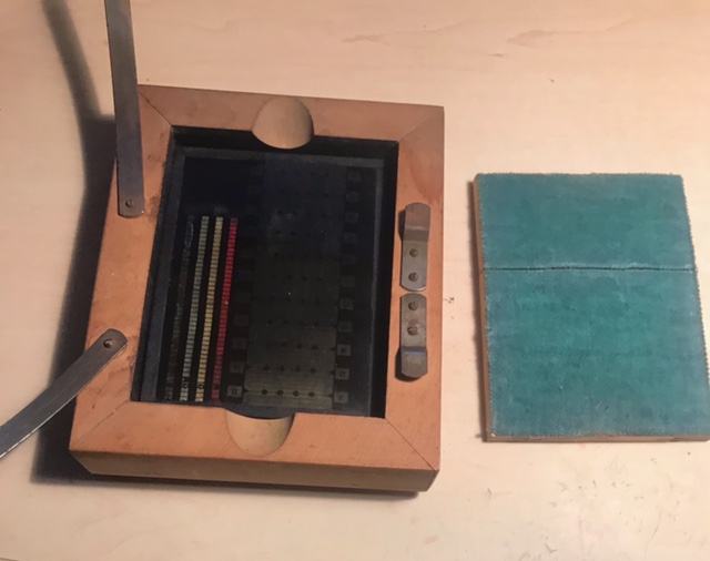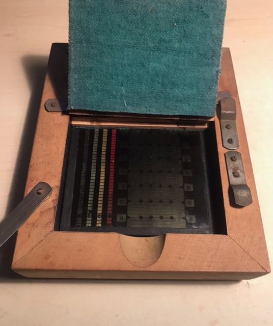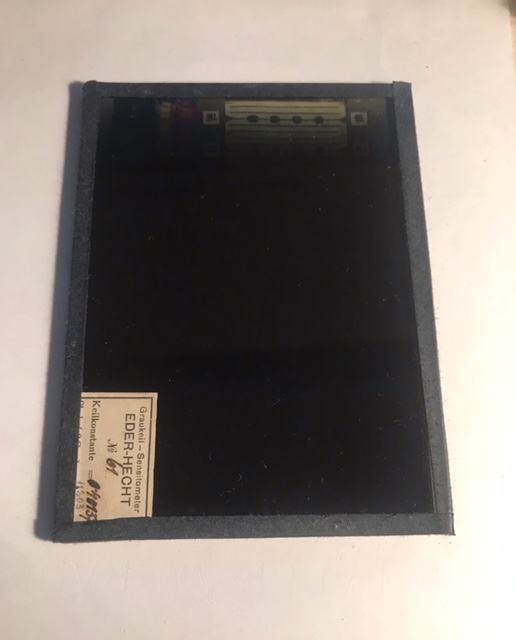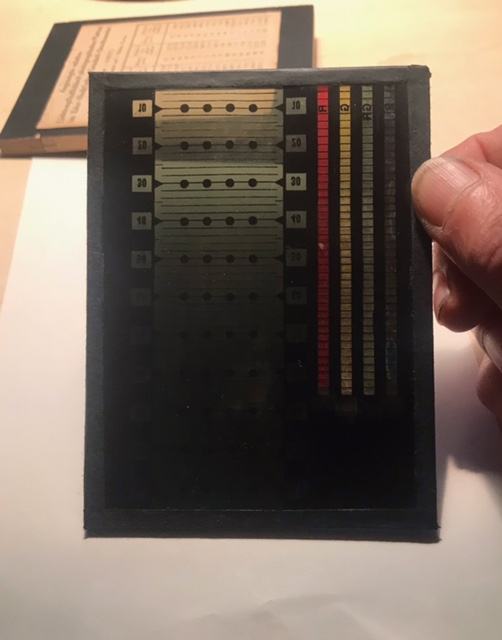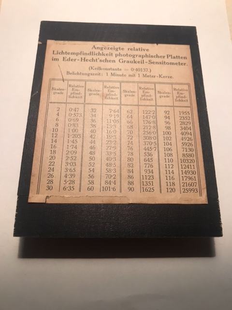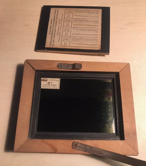 Fotogram senzitometra sa sivim klinom prema Ederu i Hechtu na staklenoj ploči u drvenom kučištu+još jedan sivi klin s okvirom.