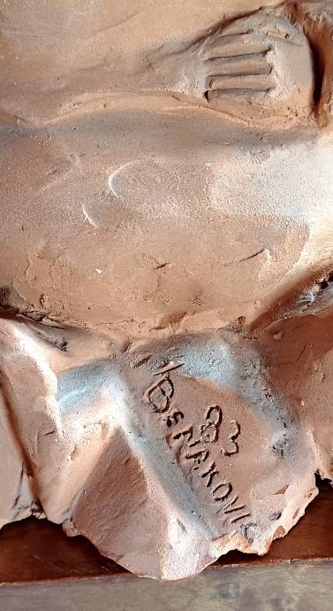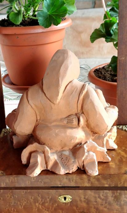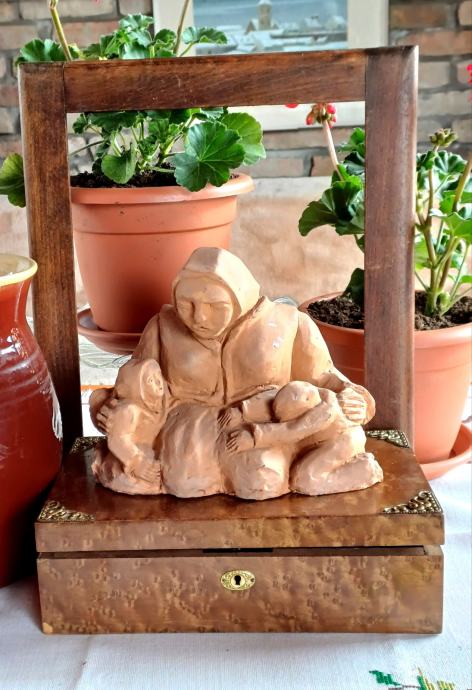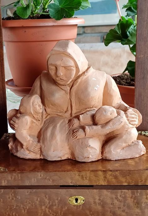 Zanimljiva skulptura od terakote. Iz naglašene robusnisti grije i nježnost. Autor Miro Benaković.