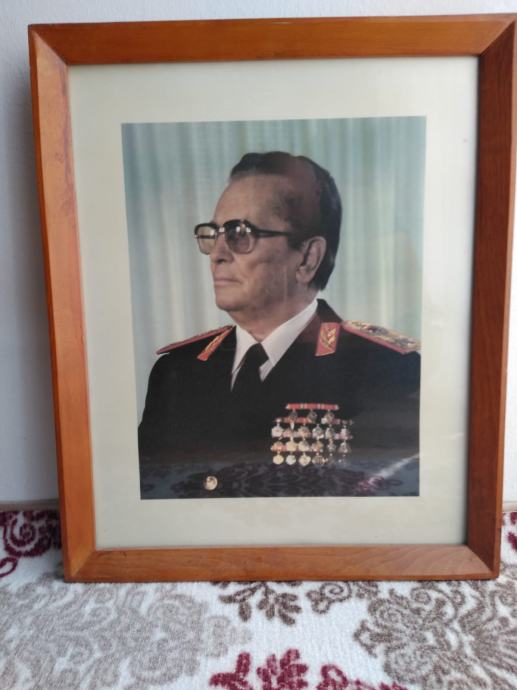 Slika Josipa Broza Tita uokvirena u kvalitetan drveni okvir. Jako očuvano. Dimenzije slike 57 x 47 cm.