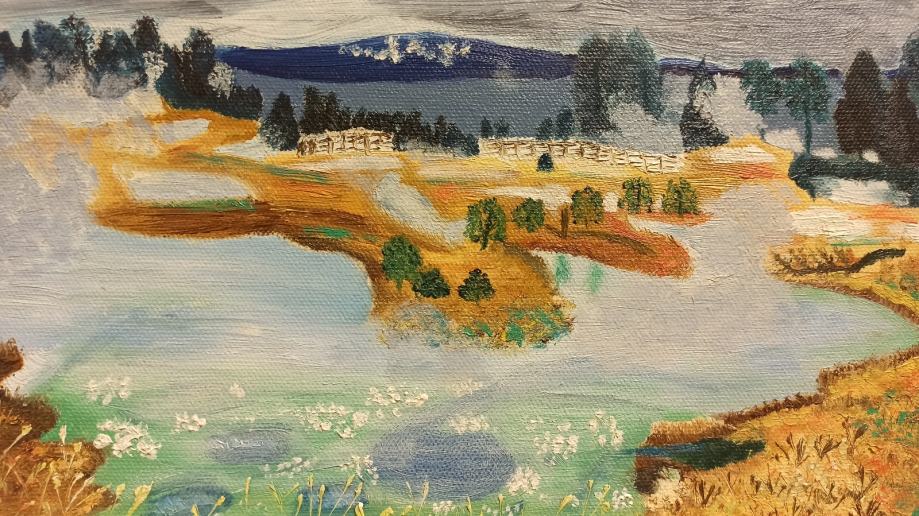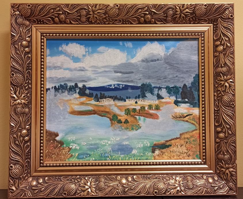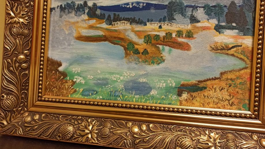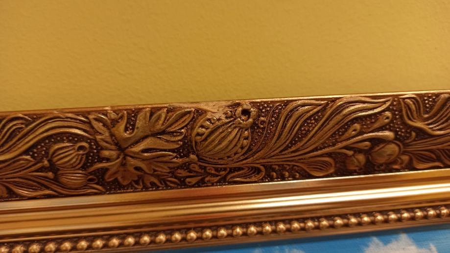 Prodajemo ulje na platnu nepoznatog autora. U raskošnom je okviru ukupnih dimenzija 40x34 cm (sama slika je 30x24 cm). Iz obiteljske je kolekcije, izvrsno očuvano, osim sitnoga oštećenja okvira na gornjemu dijelu (vidljivo na slici).