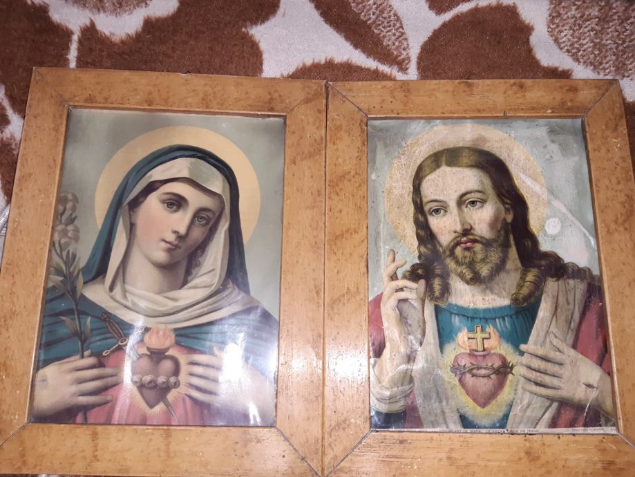 Komplet dvaju slika navedenih dimenzija, srce Marijino je u odlicnom stanju, a na slici srca Isusova nedostaje staklo na okviru