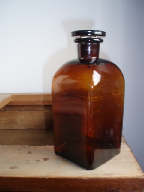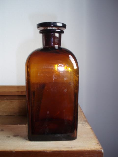 smeđa apotekarska flaša sa brušenim staklenim čepom, neoštećena, visina 18 cm, dno 7,5x7,5 cm