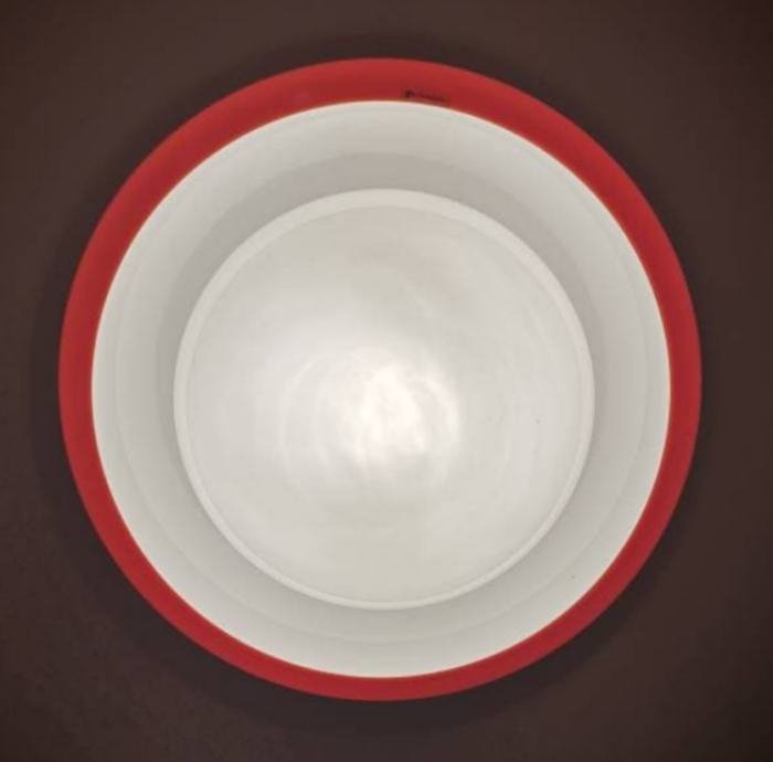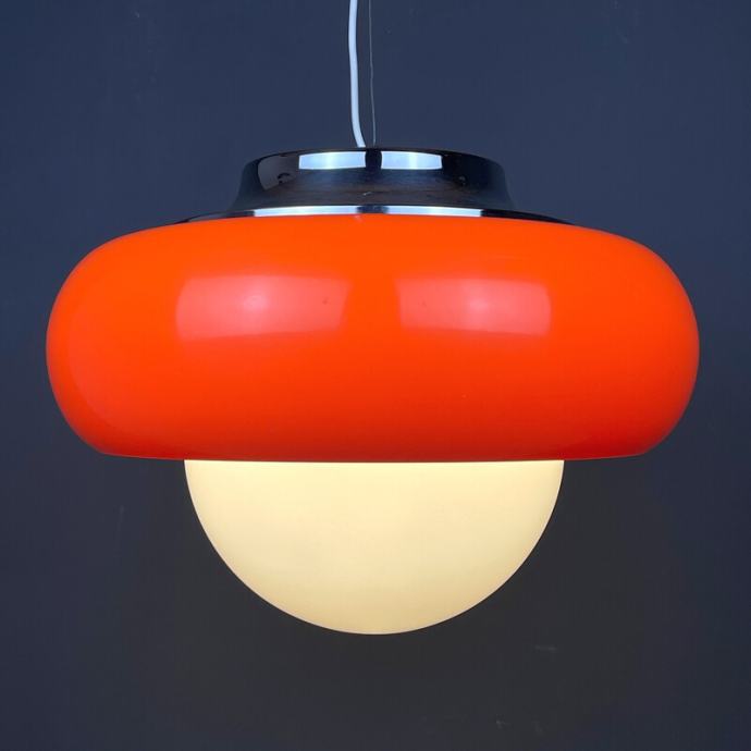 Space age plafonska viseća svjetiljka, model Jadran , proizvođača Meblo po licenci Guzzini iz 1970-tih godina. Proizvela ga je tvrtka Meblo, Jugoslavija, kao dio kolekcije Guzzini, talijanskog proizvođača rasvjetnih proizvoda. Ovaj model je L, sa narančastim sjenilom od plexiglasa specifičan je po staklenoj kugli mliječno bijele boje i savršenog svemirskog dizajna.