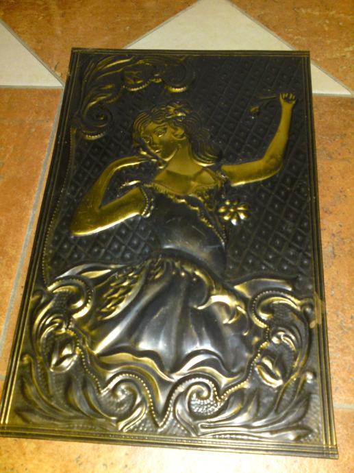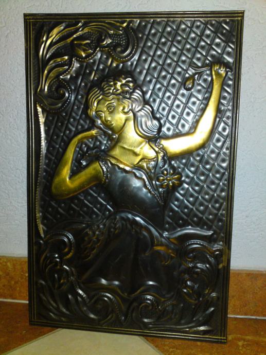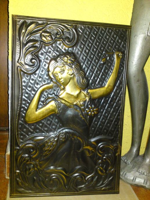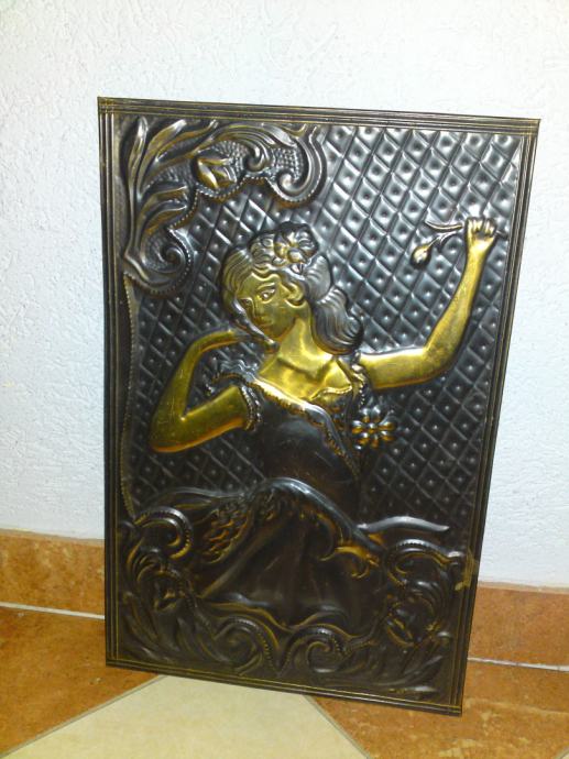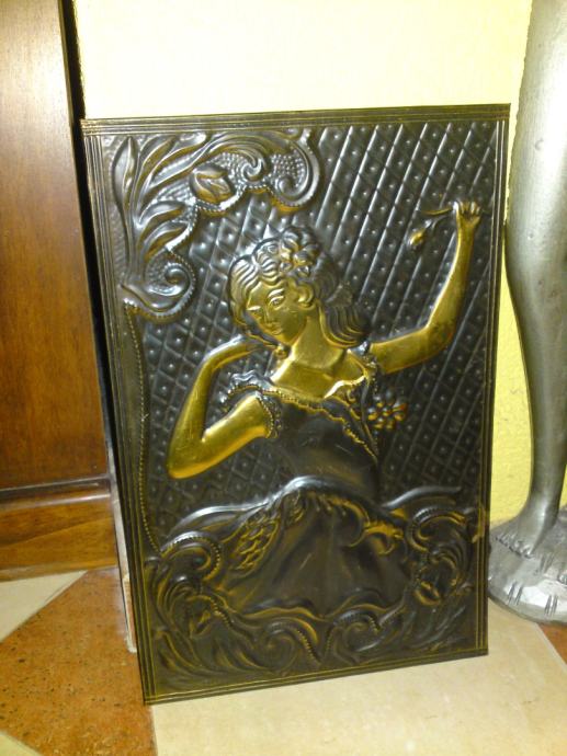 Stari reljef od mesinganog lima, na lesonitu, lik plesačice - Španjolke, sa motivima - u stilu secesije, dimenzije: visina: 43,5 cm; širina: 28,0 cm.