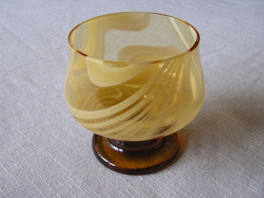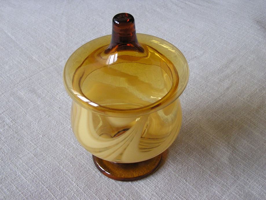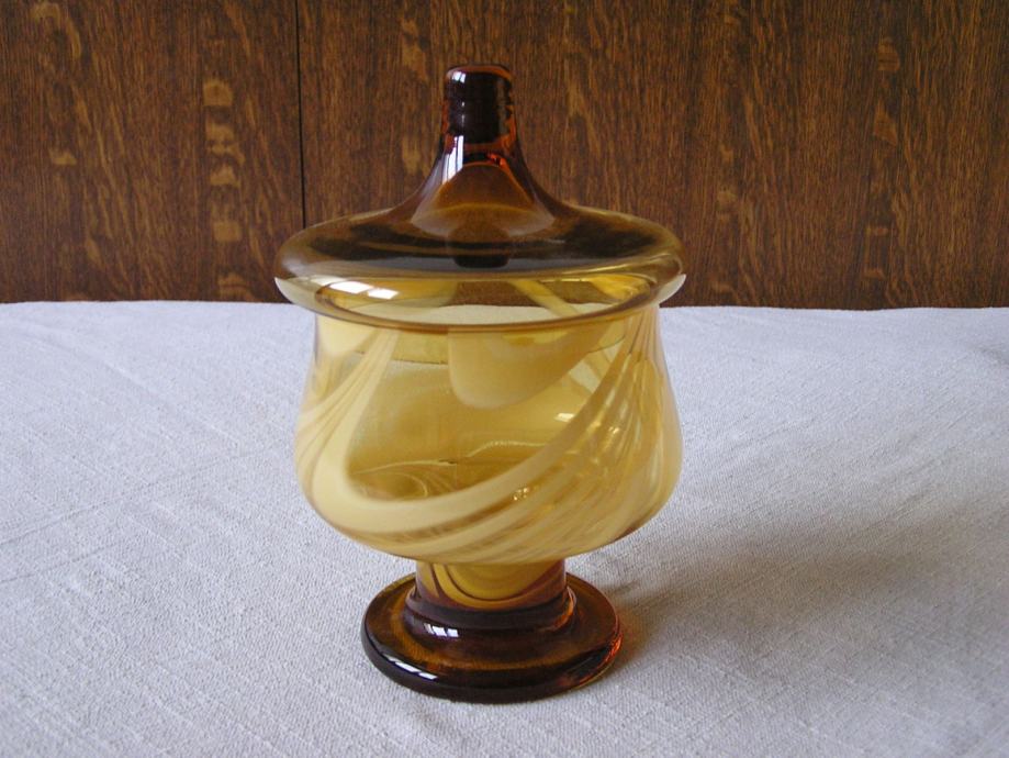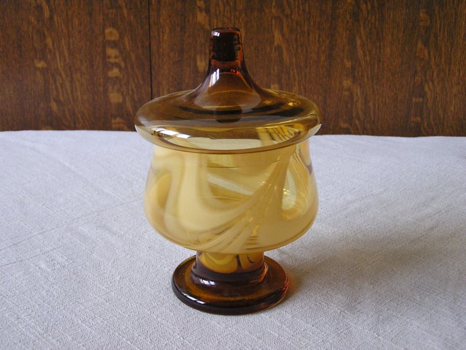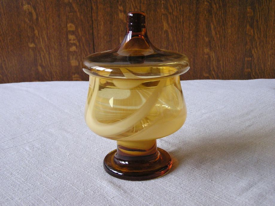 Posuda za bombone od stakla boje jantara, na kratkom stalku, ukrašena u stilu Murano stakla. U odličnom je stanju, bez oštećenja, vrlo efektna.