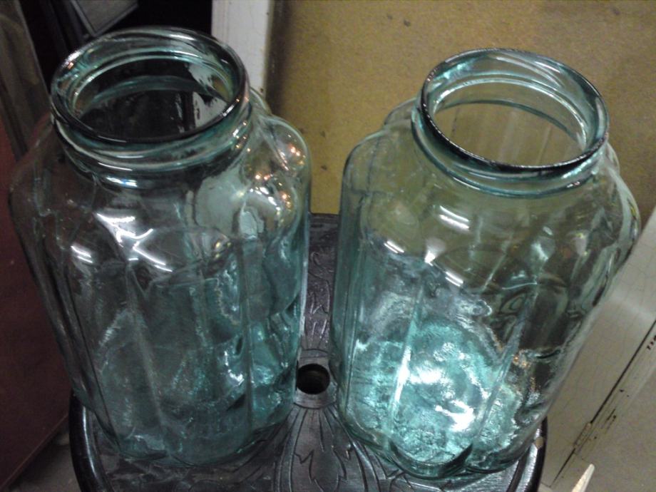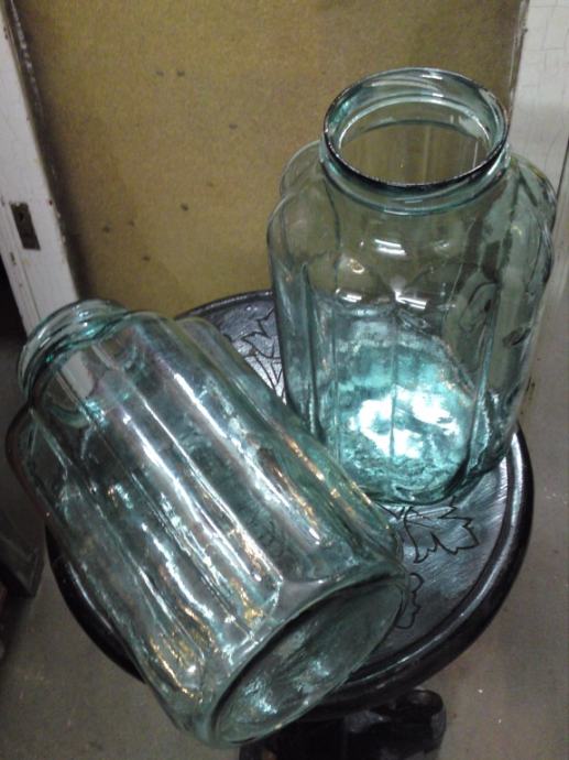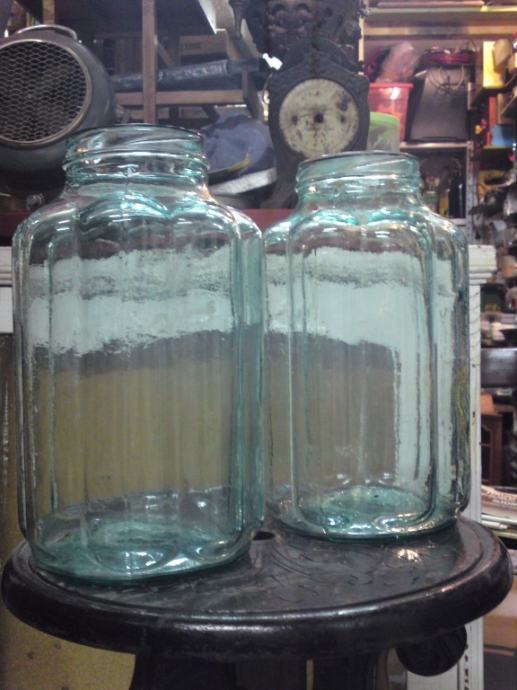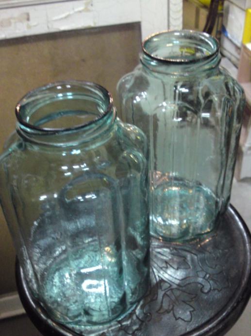 2 stare staklene posude, zelenkaste boje i neobičnog oblika iz doba art deco-a; u odličnom stanju, neoštećene.