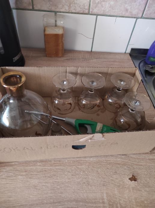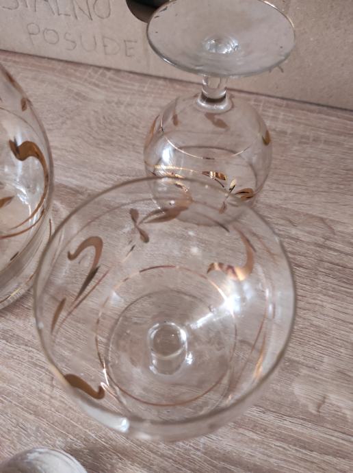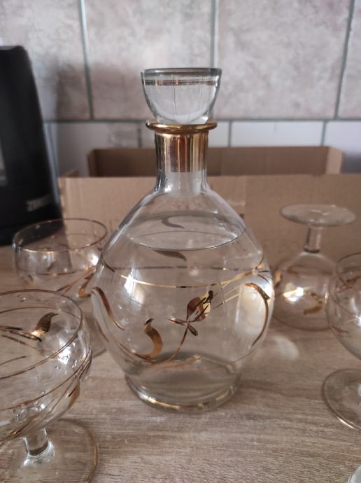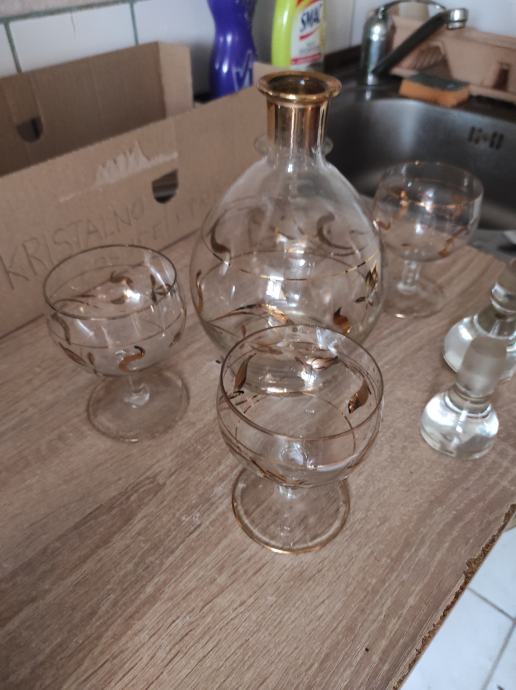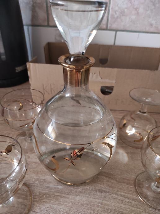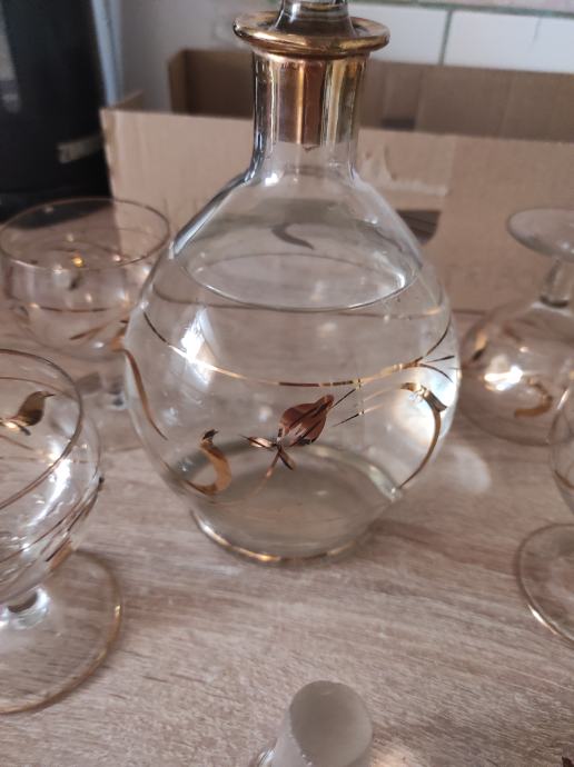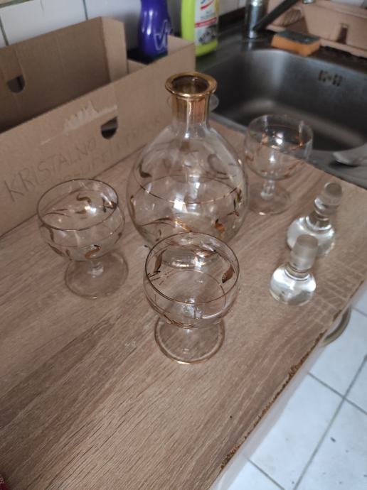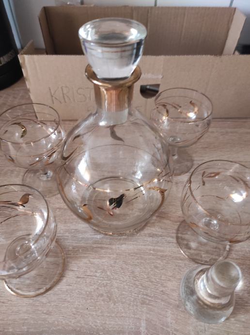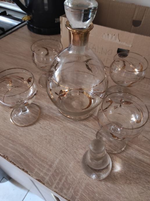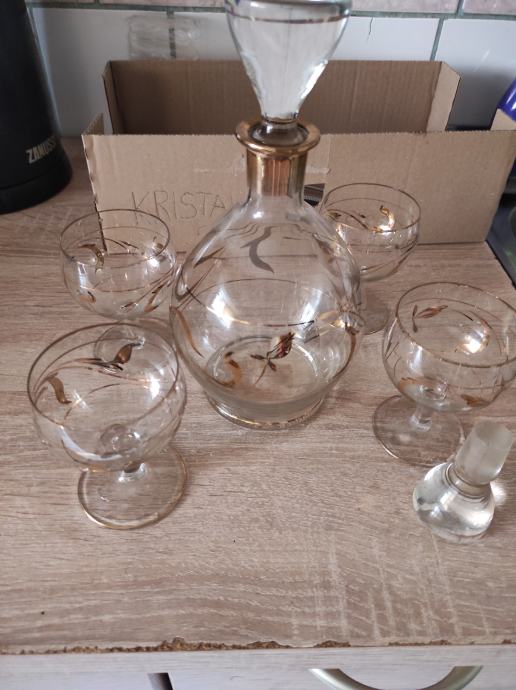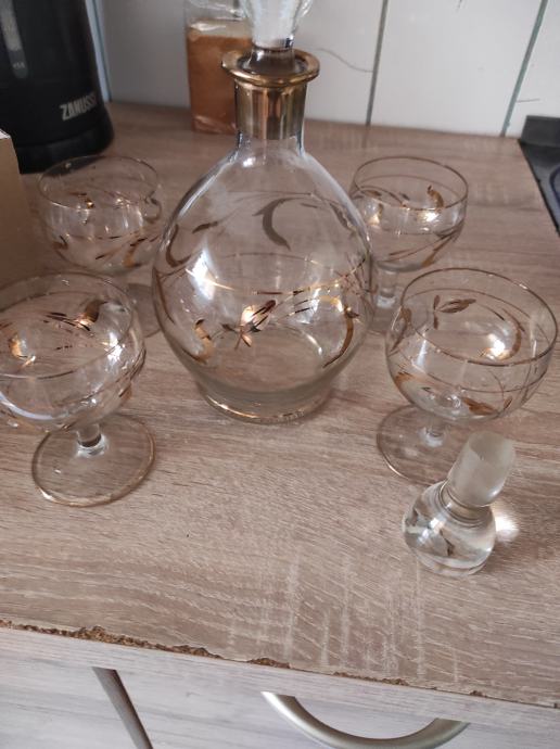 Bokal od 1L sa dva različita čepa i 4 caše od tankog stakla od 1,5 decilitra.Set je bio od moje bake i dosta je star,stanje je odlično,skoro pa ne korišteno.Za sve informacije nazovite ili pošaljite upit na Viber ili Njuskalo, a Šaljem POŠTOM ili TISKOM ili u dogovoru sa kupcem.VIDI SLIKE!!