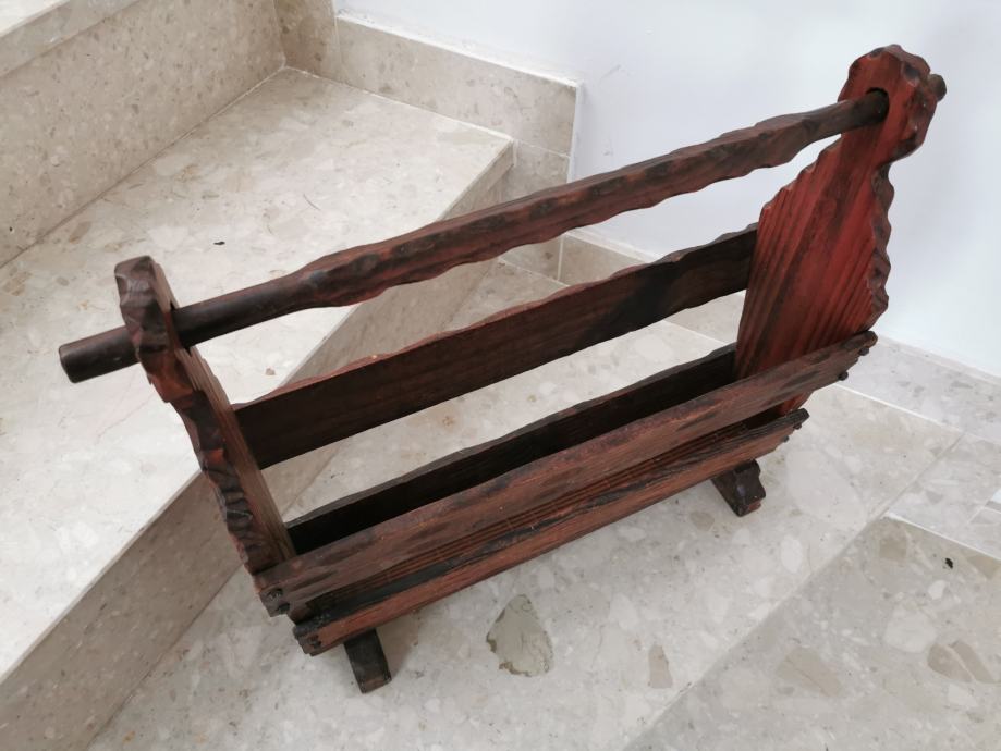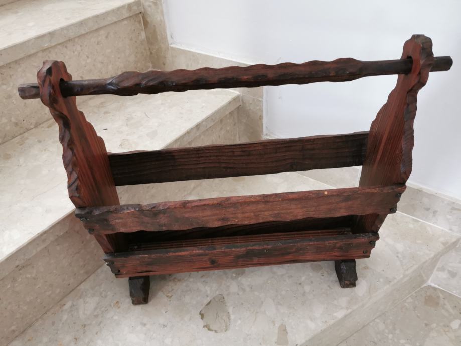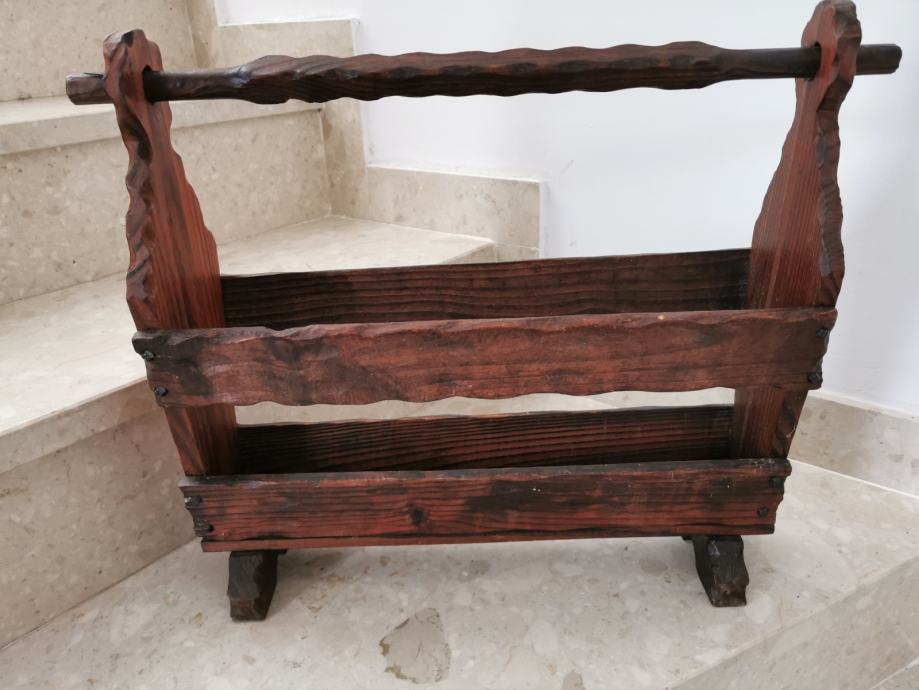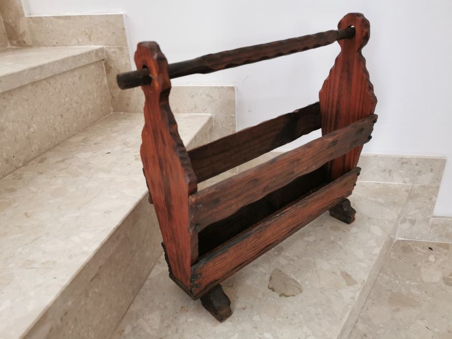 Stalak za novine rustikalnog izgleda, puno drvo, zdravo, lijepo izrađeno, očuvano. Dužine 55 cm, visine 45 cm i širine 15 cm. Kolekcionar kolekcionaru. Moguće slanje kupcu uz trošak dostave 40 kn.