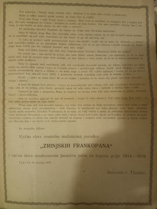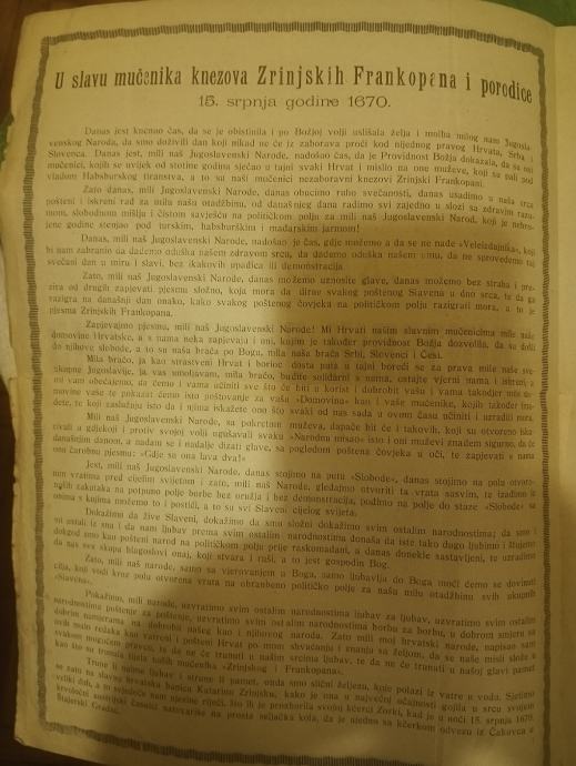 Prodajem tekst Stanislava Tkaleca "u slavu mučemika knezova Zrinjskih Frankopana i porodice 15.srpnja 1670g" kao i vječna slava nezaboravnim junacima palim na bojnom polju 1914-1919. Zagreb 30 travnja 1919 plus razglednica. Cijena za sve. Plačanje na račun ili gotovina.