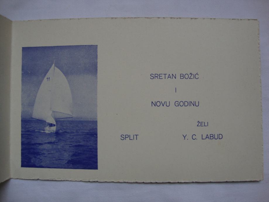 Stara čestitka Yachting cluba "Labud" 1938-1940. godine sa slikom jedrilice unutar čestitke sa tekstom -predratno