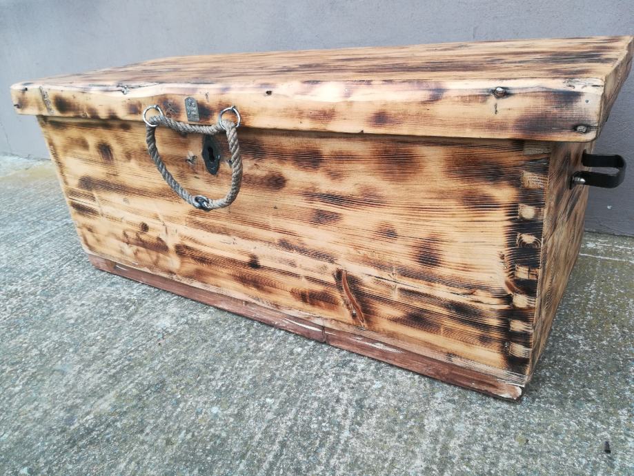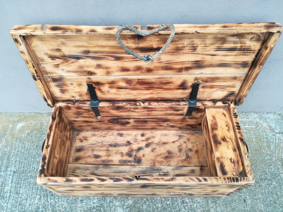 Stara drvena škrinja, potpuno obnovljena - restaurirana, škrina ima i dva mala pretinca od kojih je jedan tajni pretinac koji je teško vidljiv , služio za skrivanje vrijednih stvari :)