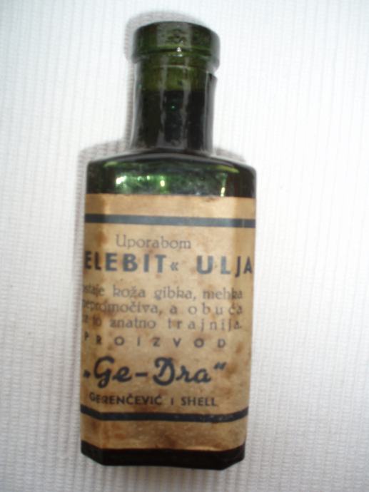 stara flašica ulja za sportsku obuću Velebit, pluteni čep, puna sadržaja, visina 11 cm