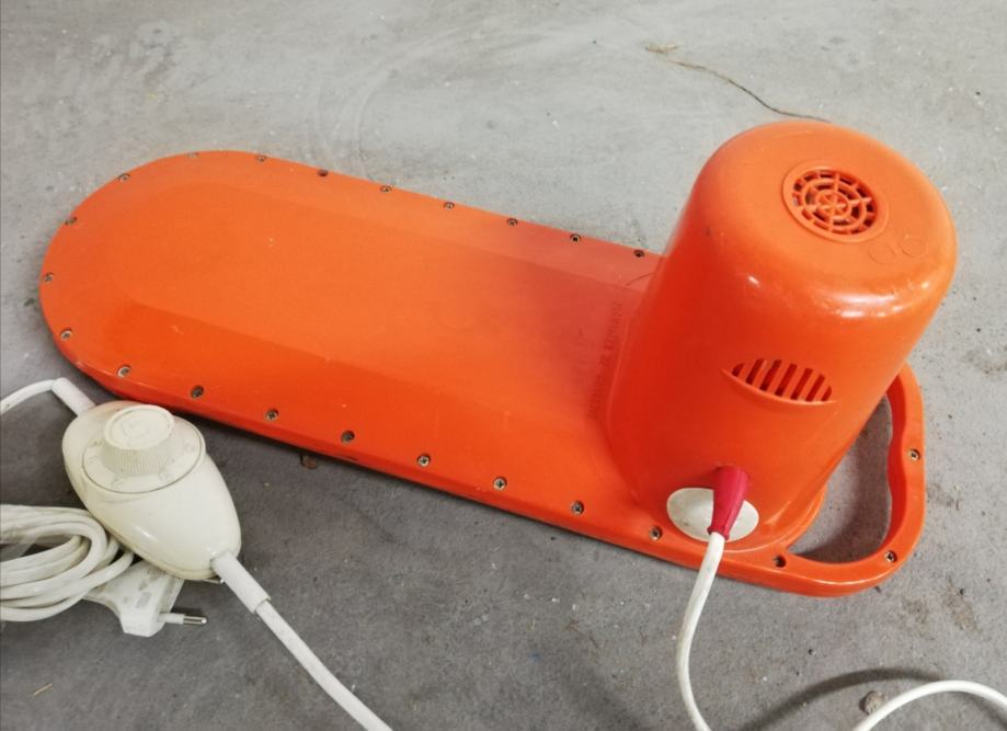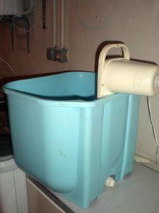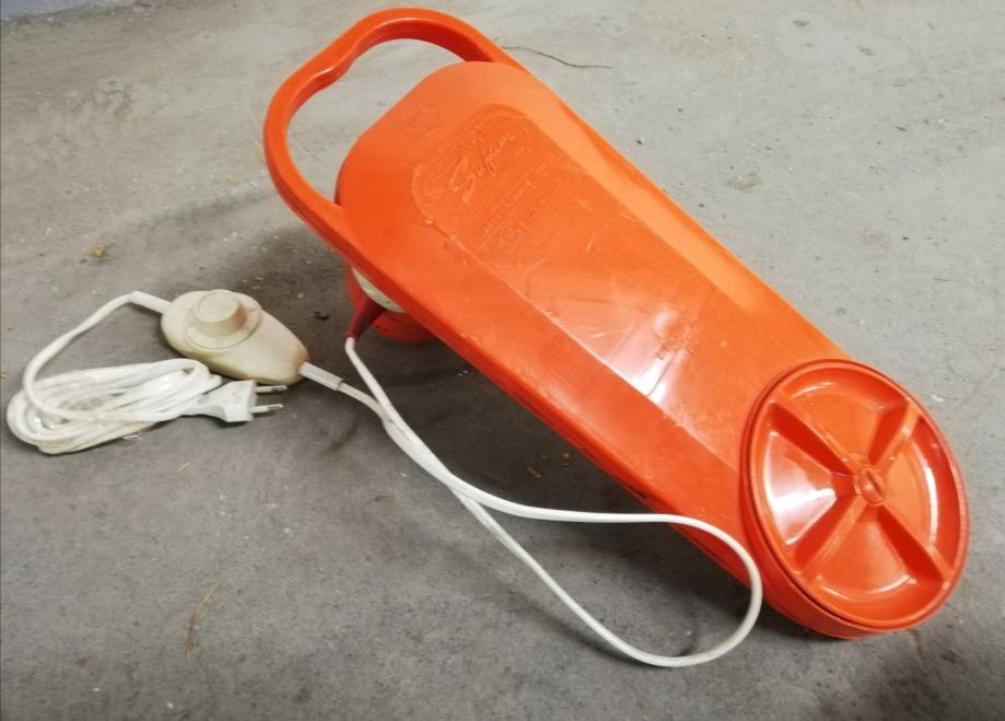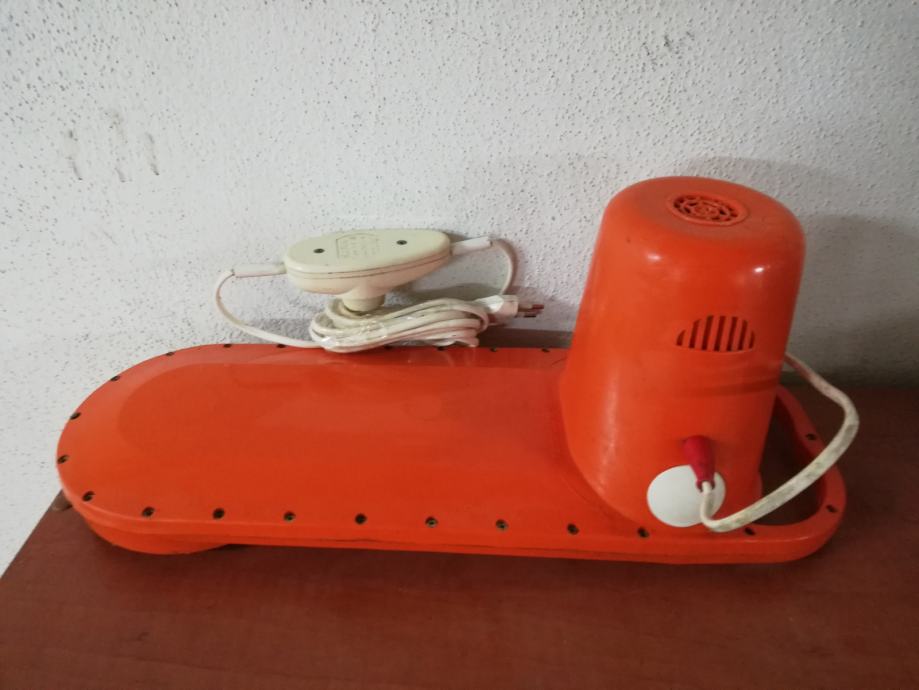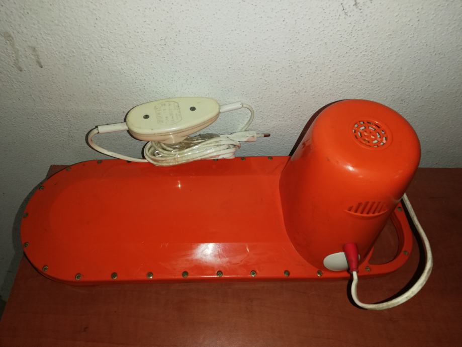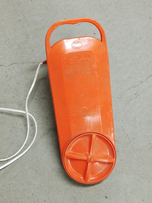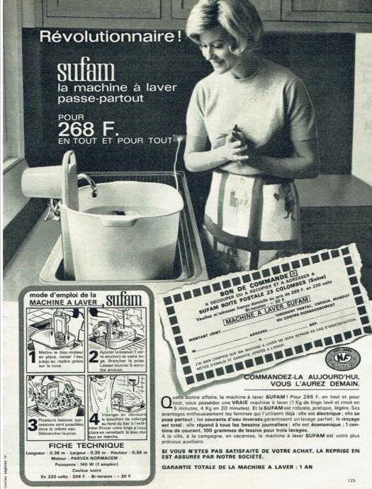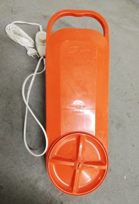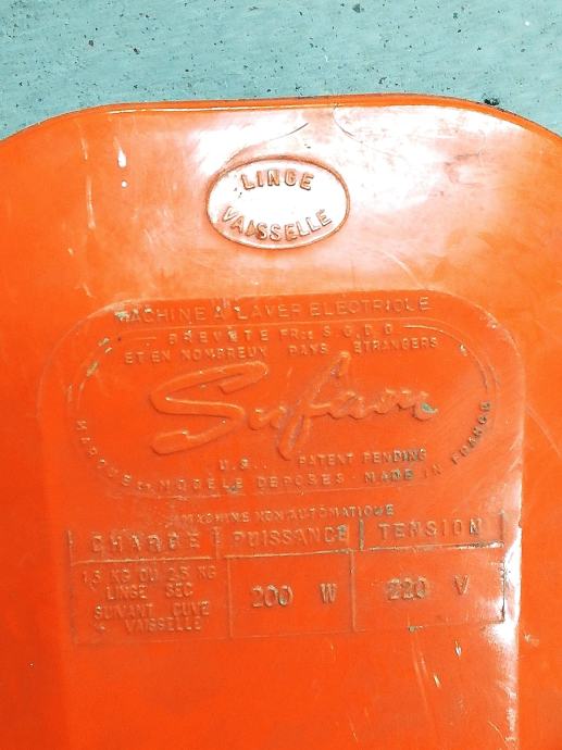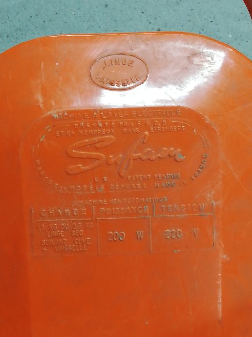 Stara originalna perilica rublja iz 1965.g, model M500. Spušta se u posudu s natopljenim rubljem i uključuje se rotirajući aktivator, tada dolazi do aktivnog miješanja vode, što osigurava učinkovito pranje rublja. Uključuje se pomoću mjerača vremena, vrijeme se može postaviti do 6 minuta. U savršenom radnom stanju. Proizvedeno u Francuskoj, u tvornici Sufam, 220 volti, 200 vata. Lagana, izvrsnog dizajna, narančaste boje, jednostavna za korištenje. Ova perilica rublja je zamišljena da bude prijenosna. Vikendom bi obitelji odlazile u svoje vikendice ili neki drugu kuću za ladanje. Ženama je to bio odličan uređaj za pranje veša. Ili su ovaj uređaj držali u sudoperu ili posebnoj plastičnoj posudi sa otvorom na njegovom dnu. Njegov rad bio je sličan standardnoj perilici za rublje, osim što se prljava voda praznila kroz rupu sudopera ili rupu posude.