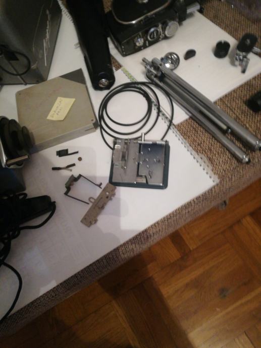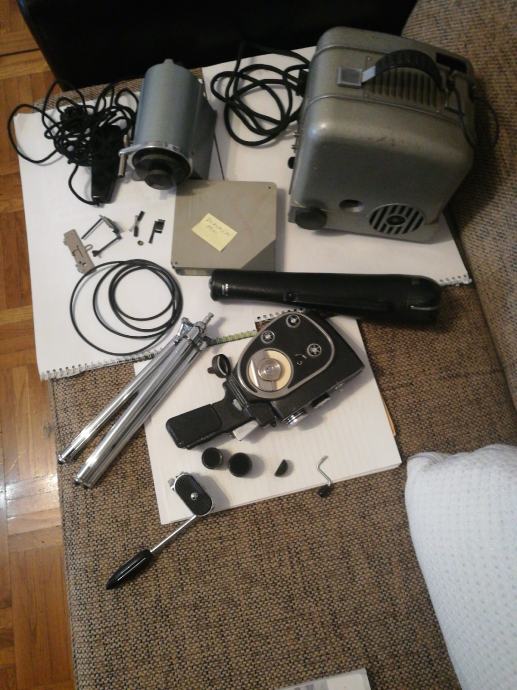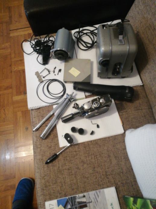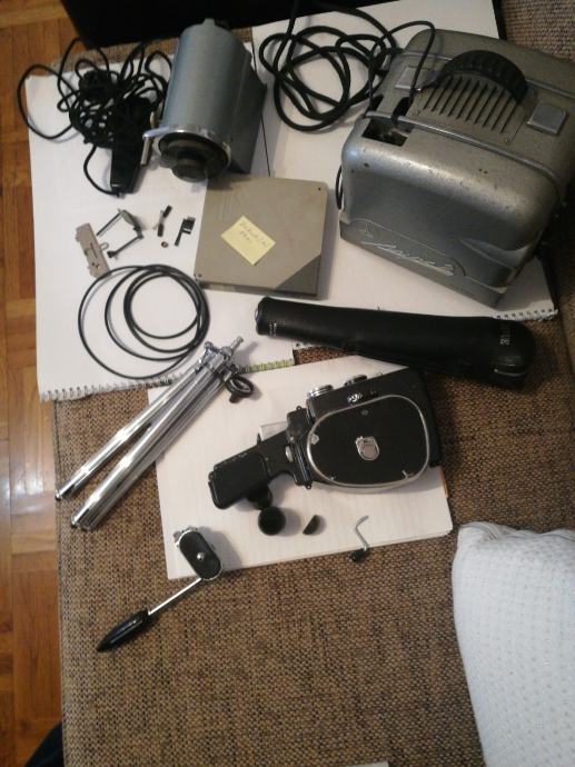 Kamera Quarz 50/60 godina,nogare na izvlačenje,leče, projektor,film,aparat za spajanje filma ,torbica nogara ,rezervne pogonske gumice,aparat za premotavaje filma