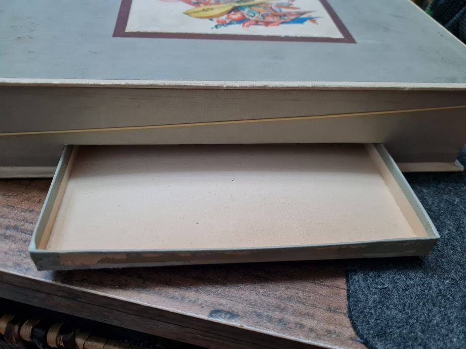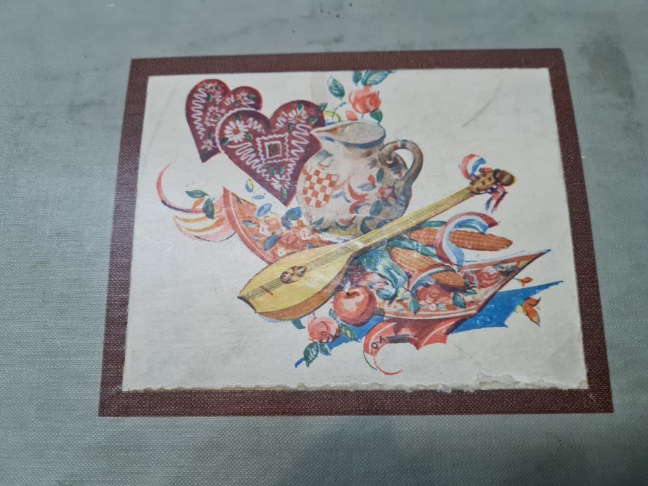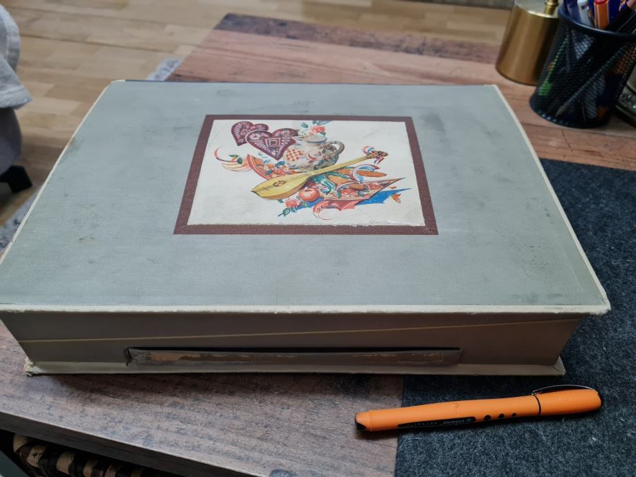 Većih dimenzija, ušćuvana, ukrasni hrvatski motivi na poklopcu, mini koverte u dva pretince, mini ladica na dnu kutije, kolekcionarski primjerak, fotografije....