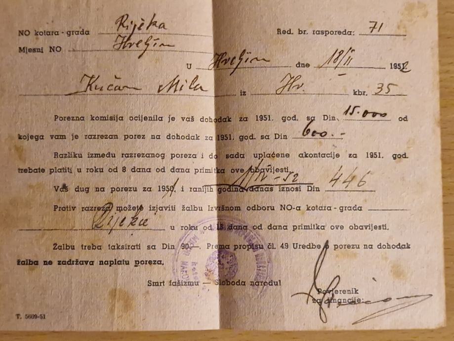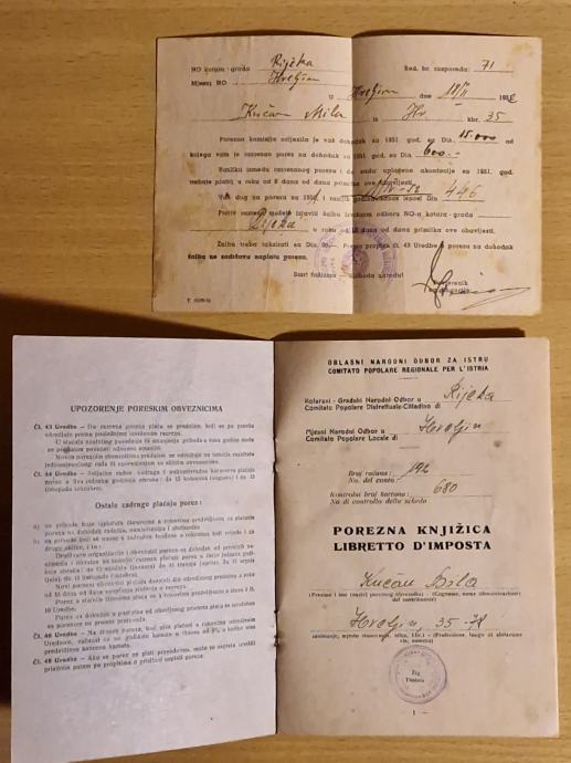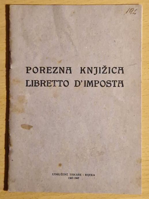 Stara knjižica Libreto d'imposta Rijeka Fiume 1947. Hreljin ONO Istra