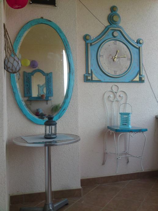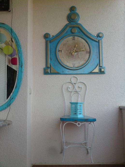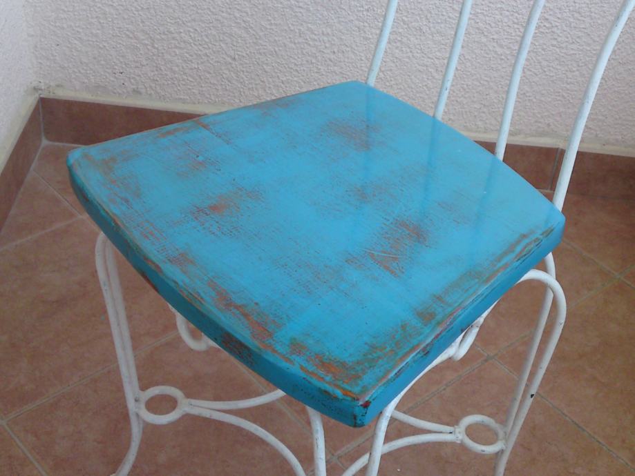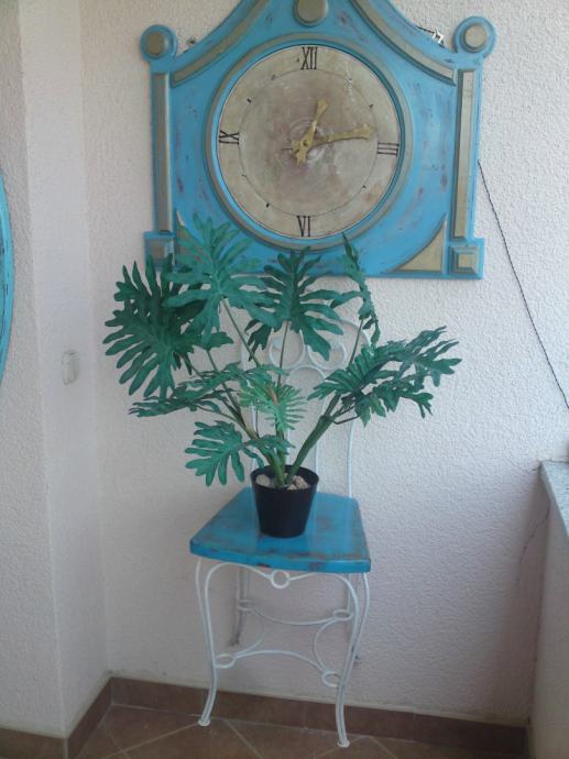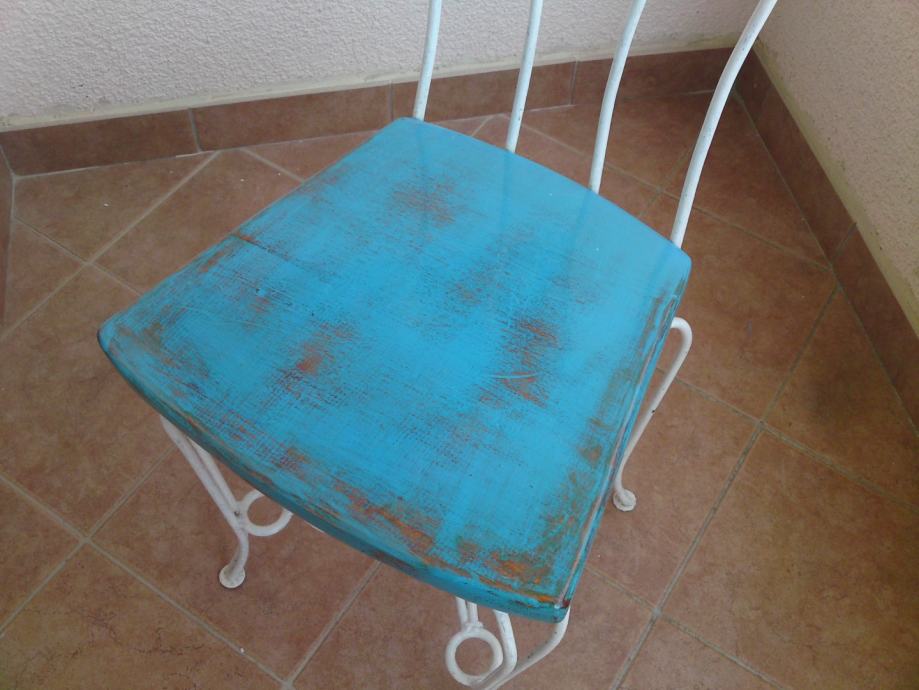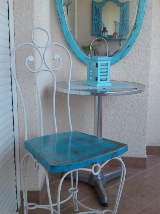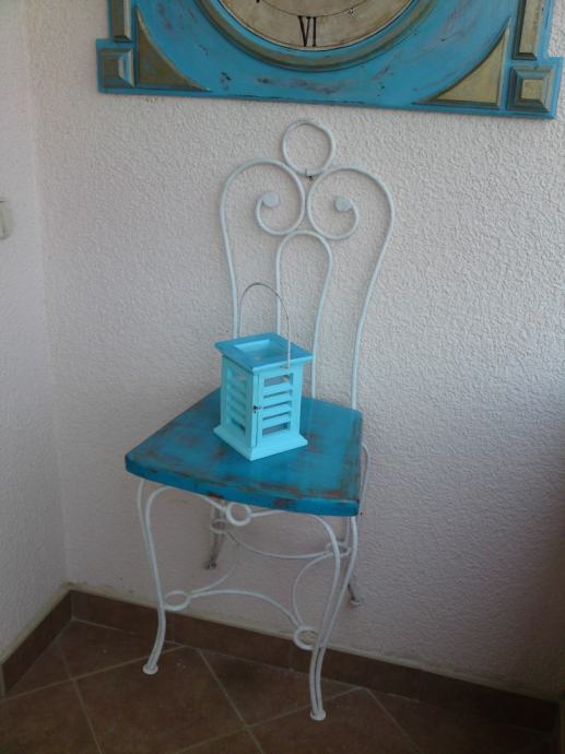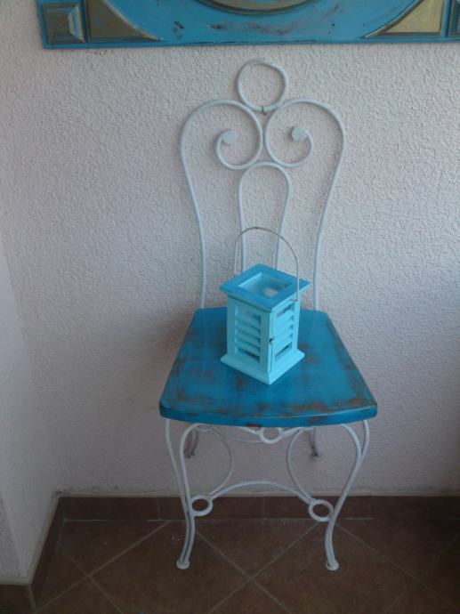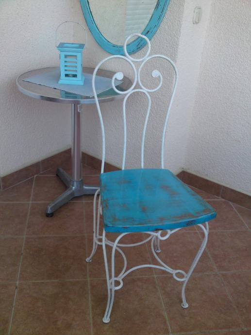 Stara kovana stolica - restaurirana, drveno sjedište: 1x mahagonij, 2 x kredasta tirkiz boja, 1 x lak; uređeno u shaby shicku. Može služiti kao polica ili stolić, ali i kao stolica. Fotke sve govore.pogledajte i ostale dekoracije.