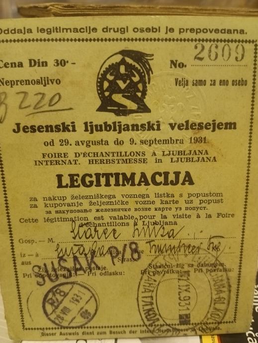 Prodajem staru legitimaciju jesenskog Ljubljanskog velesajma iz 1931g. Stanje odlično. Plačanje na račun ili gotovina.