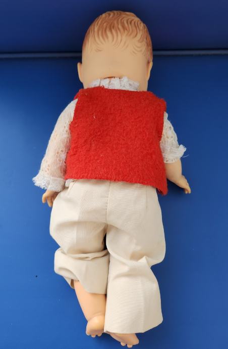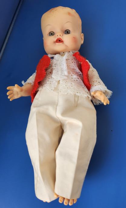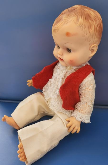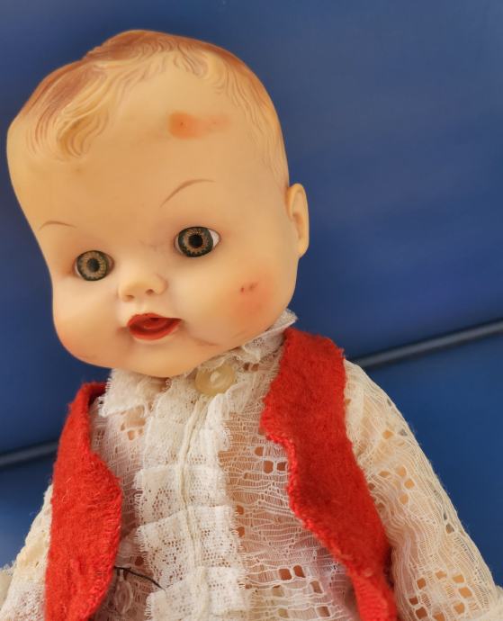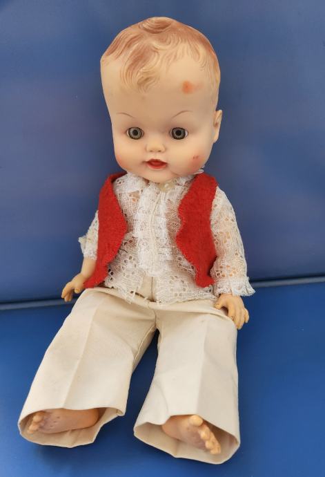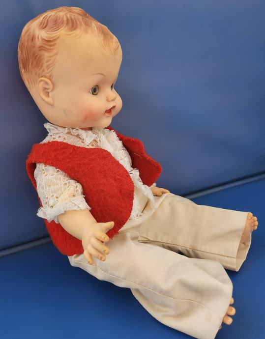 Materijal : glava i ruke guma,tijelo i noge tvrda plastika, oči staklene
