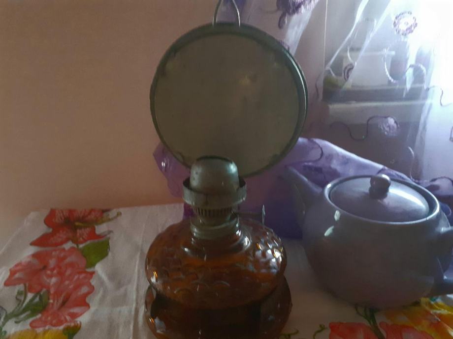 Petrolejska lampa,kupljena oko 1930,nedostaje cilindar .Služi za ukras,lijepa boja stakla.Uz cijenu idu i pt.
