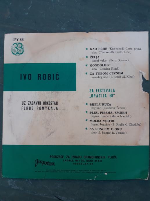 Prodajem staru plocu Ive Robica sa festivala Opatija 1958 godine u odlicnom stanju i u originalnom omotu za 13 eura.
