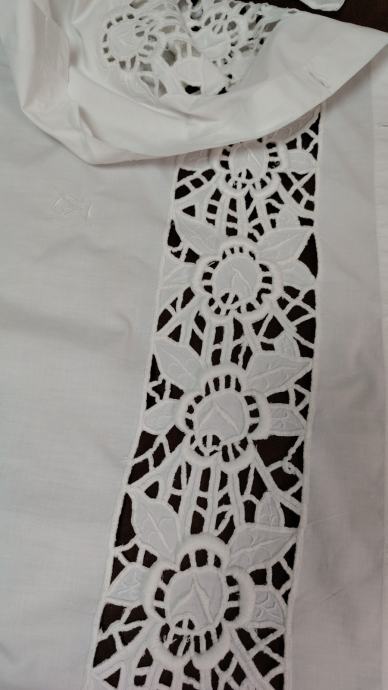 Heklani stolnjak srednjica staro platno veličine 100x62 =20 eura.