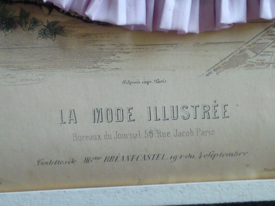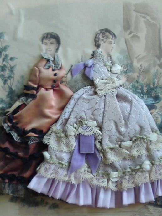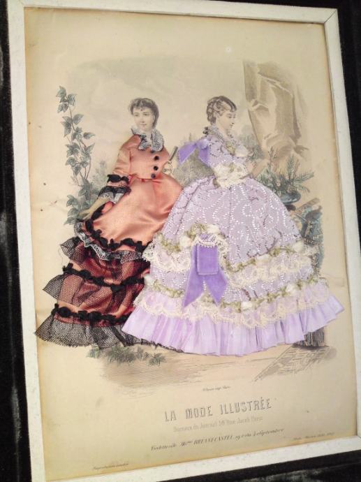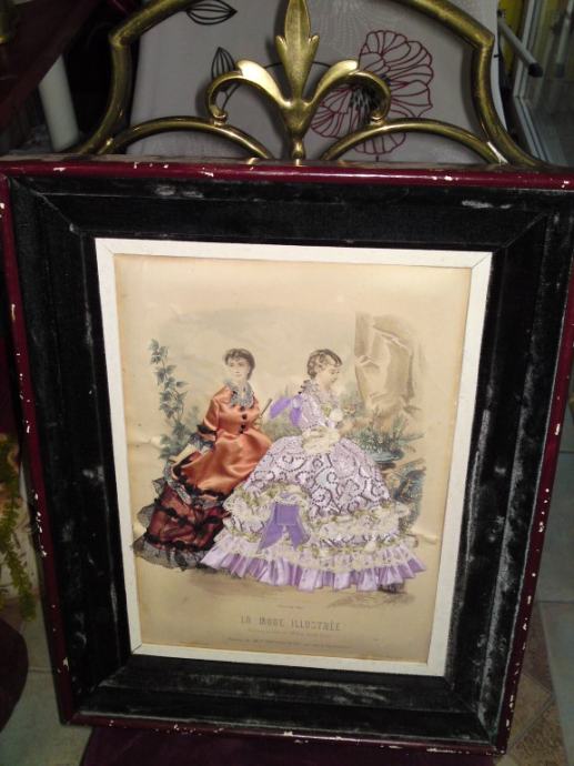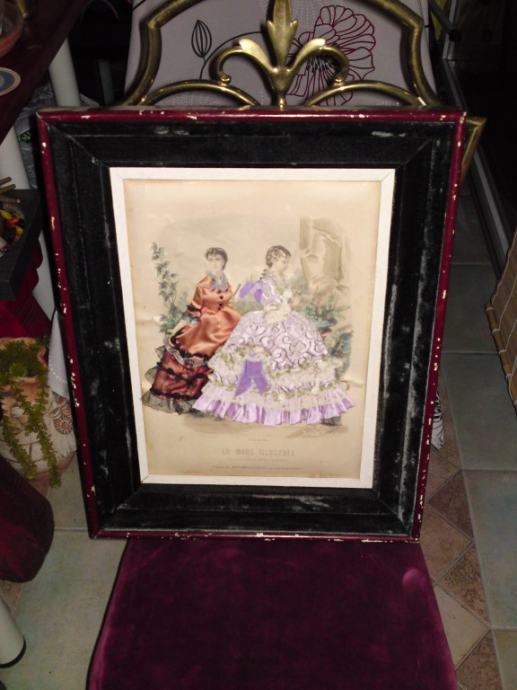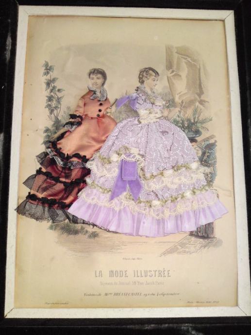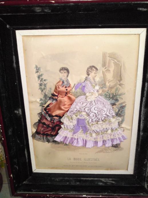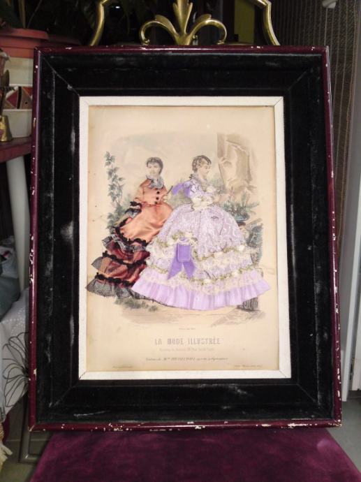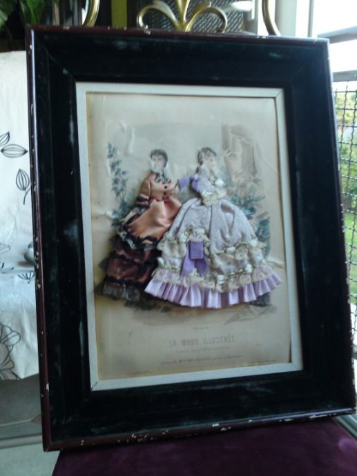 Stara reklama sa prijelaza 19./20. stoljeća; podrijetlo: Francuska; koja je krasila prodavaonice najfinijom tekstilnom robom za žene. Materijal: drvo, papir, tkanina. U solidnom stanju.