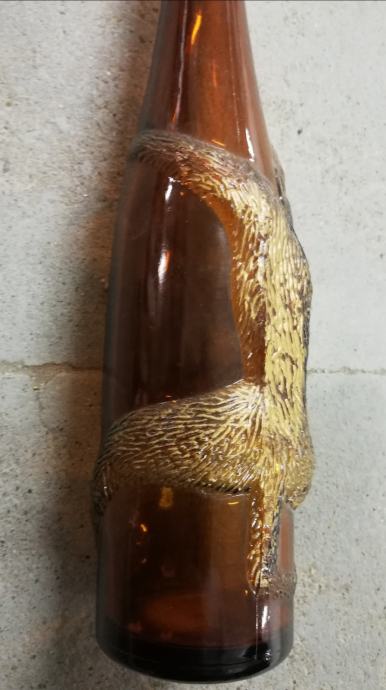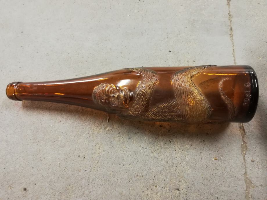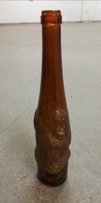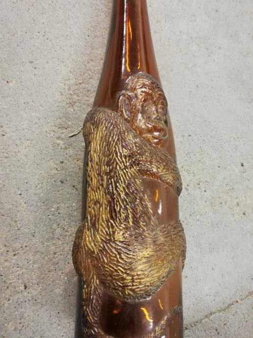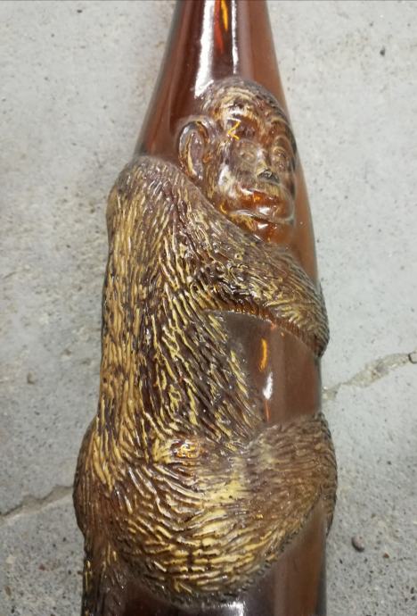 Stara reljefna staklena boca, majmun, koji je obgrlio bocu, visina 35 cm, sadržaj 0,75 ltr.
