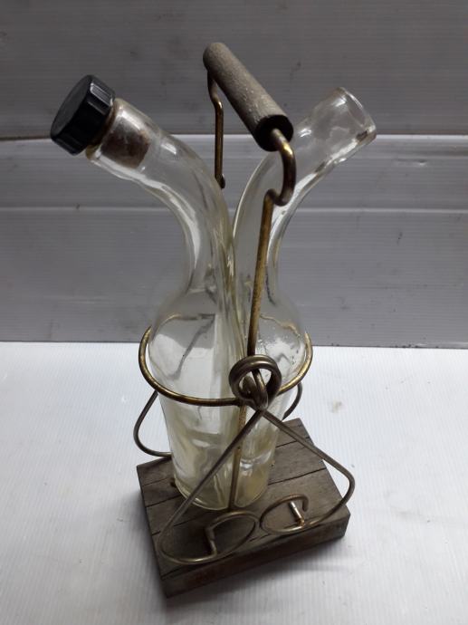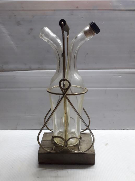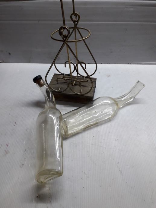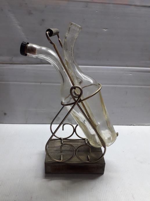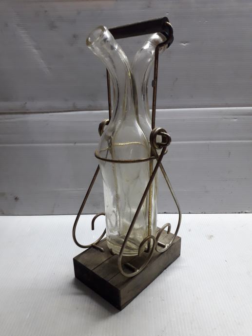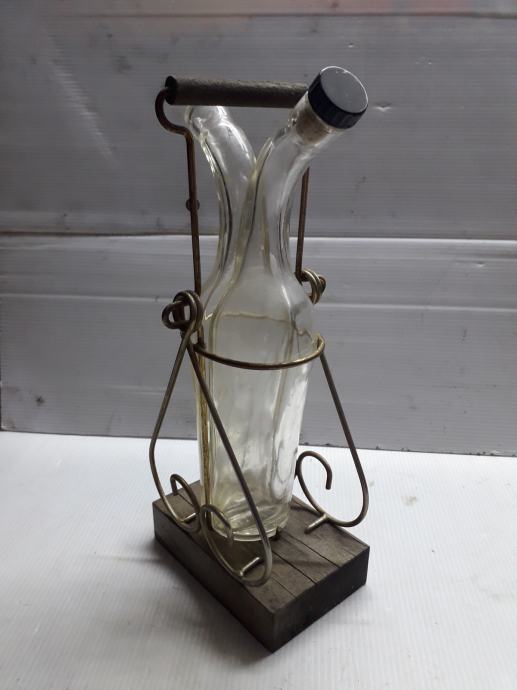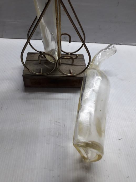 Staklena boca iz dva dijela za bijelo i crno vino po pola litra na drvenom postolju i metalnoj pomičnoj konstrukciji veličine 36cm visina, postolje 15 x 10cm.