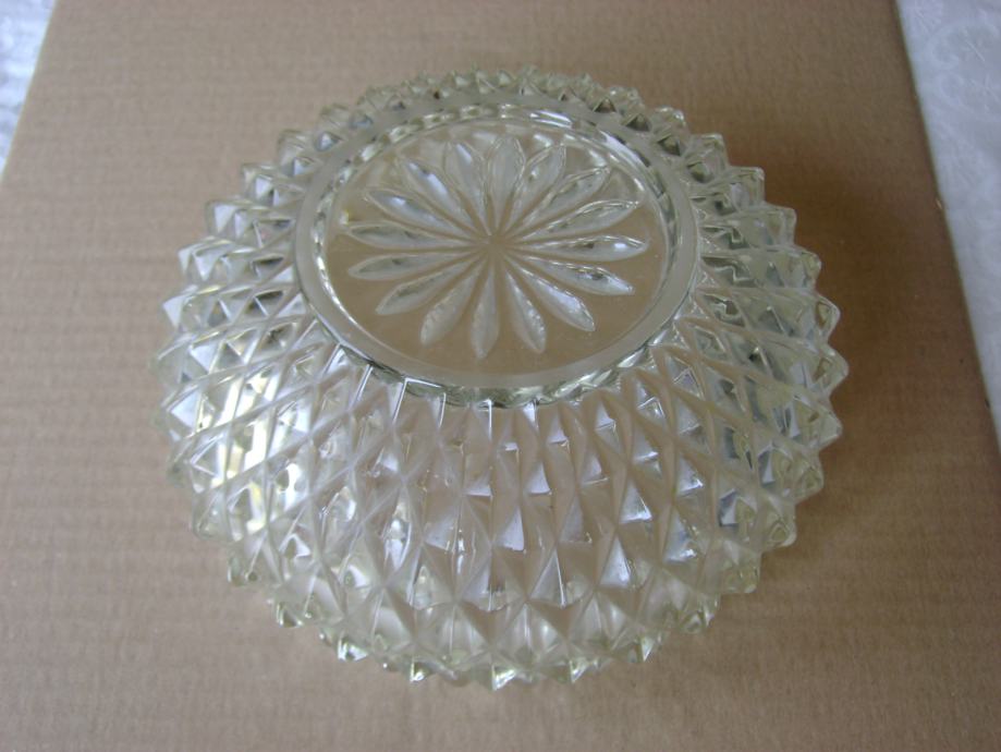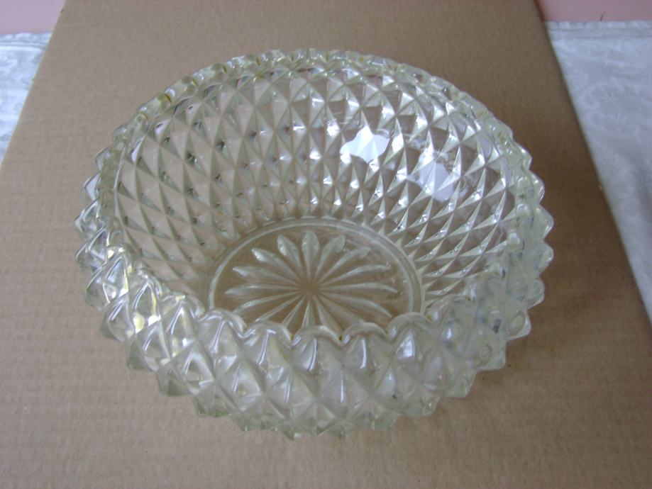 Stara staklena zdjela za grickalice ili voće visine 8 cm, promjera 19 cm na najširem dijelu, korištena, odlično očuvana, bez oštećenja - stanje je vidljivo na slikama.