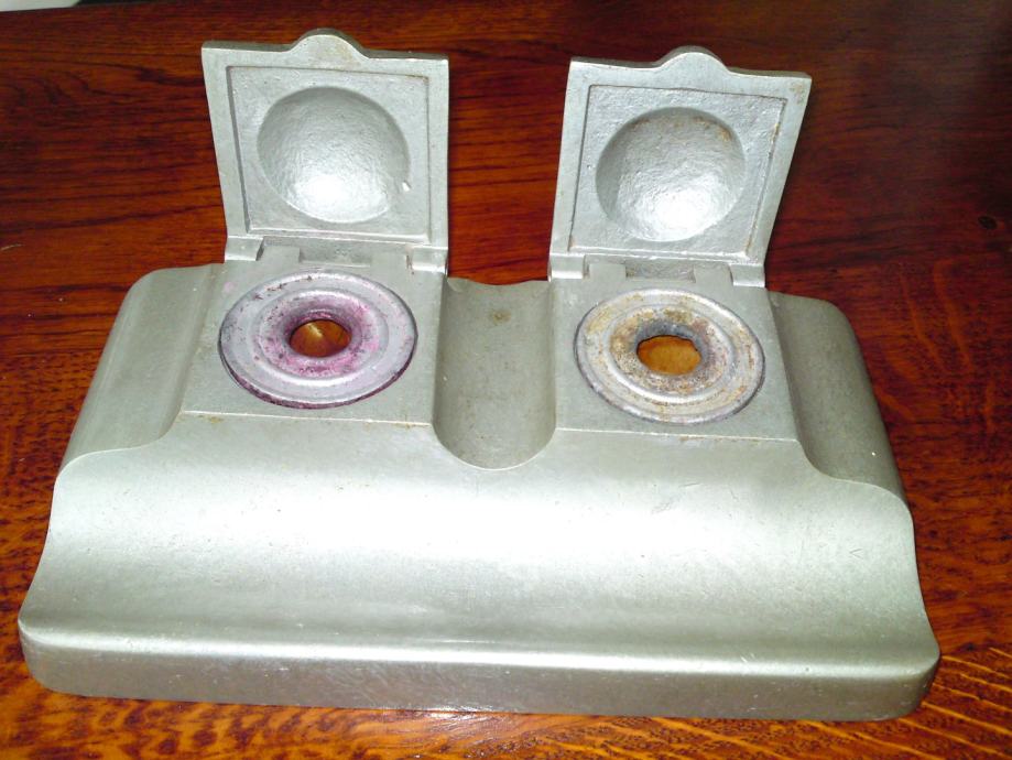 Stara tintarnica u odličnom stanju, sa 2 otvora, sa 2 porculanske posude i 2 kositrena prstena, ART DECO. Fotografije sve govore.