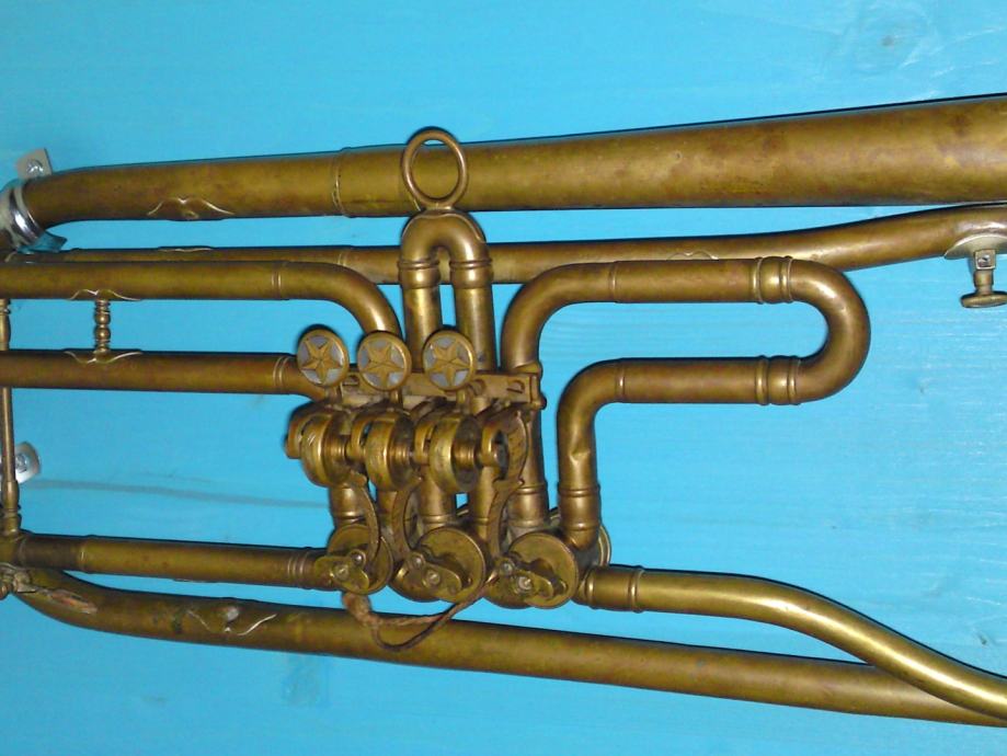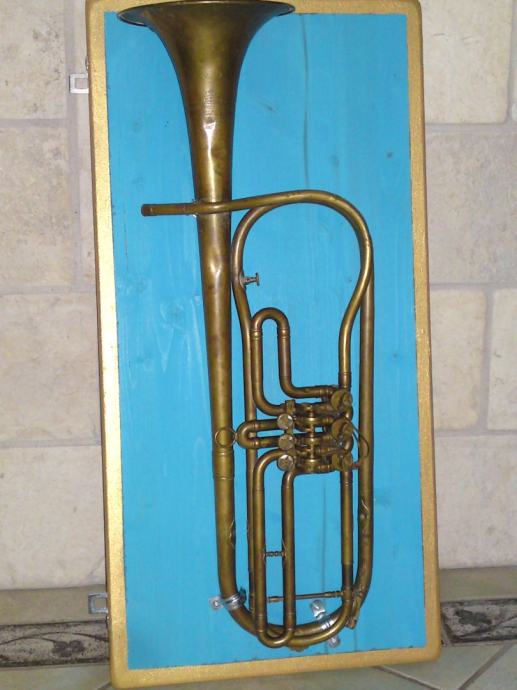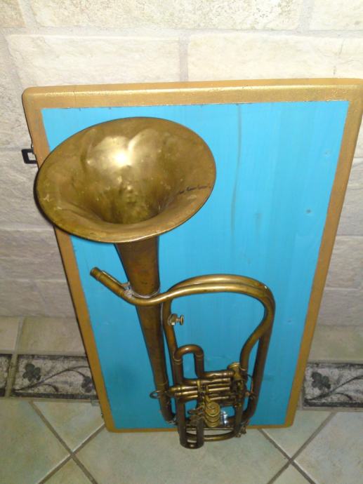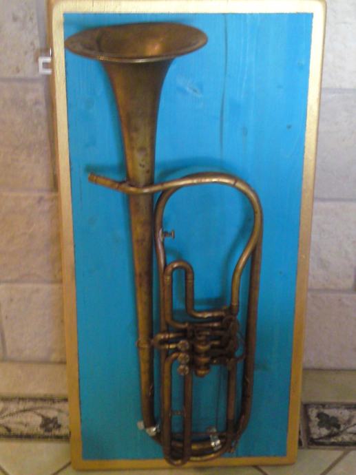 Stara truba na dekorativnoj drvenoj ploči sa ovjesima za vješanje.