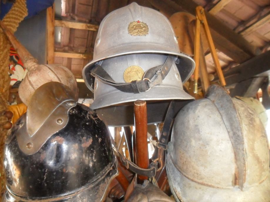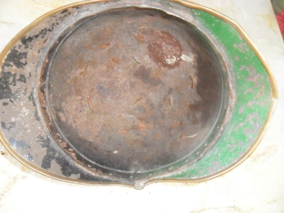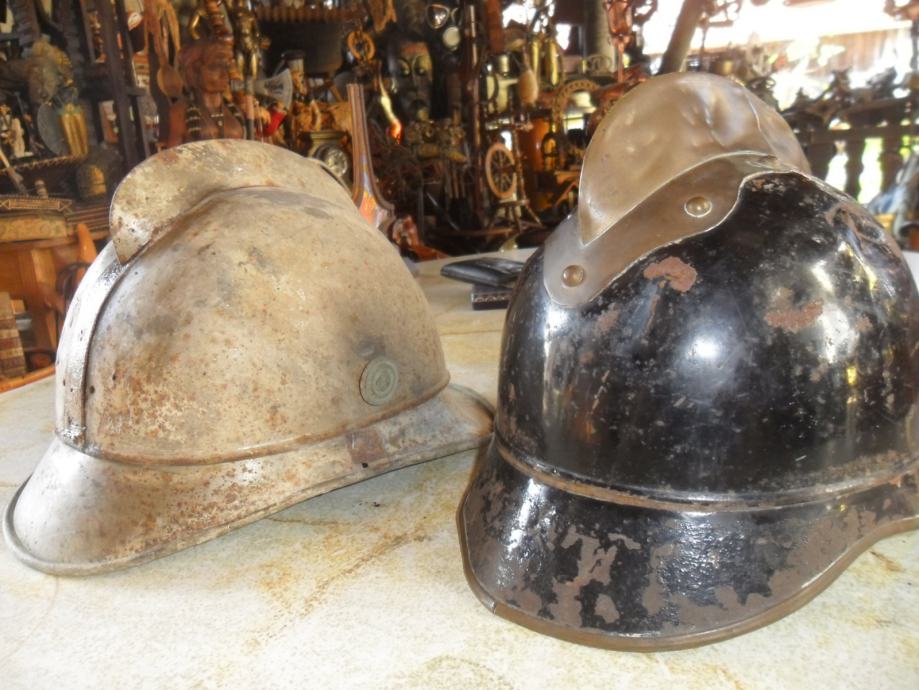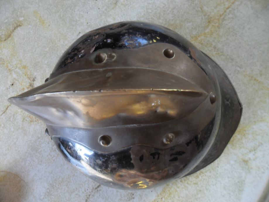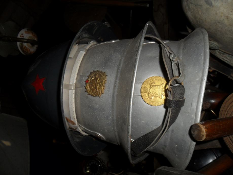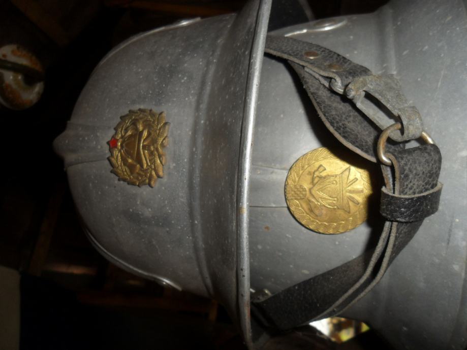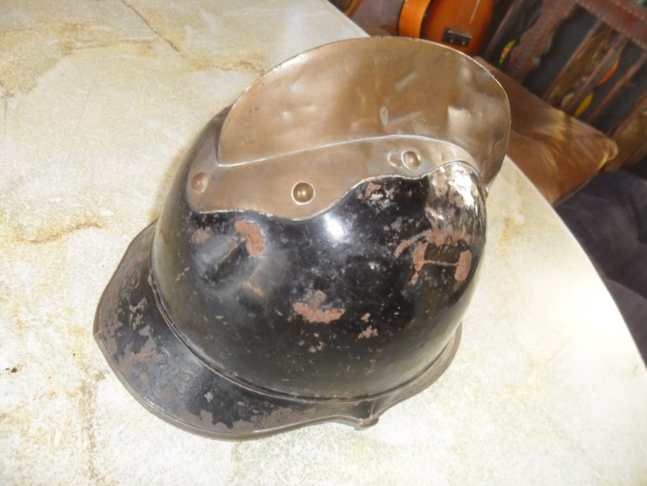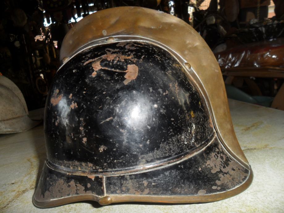 potječe negdje od 1905 godine,dosta je sačuvana za svoje godine i još ima originalnog laka na njoj,ovo je kaciga od vatrogasnog časnika(na par slika imate od običnog vatrogasca koji nije ni blizu časničkog ali je istih godina i dimenzija)ova crna ima po sredini mesingani ukras(irokezica),te kompletno obložen cijeli kružni rub,,, na njoj ima brončanih i aluminijskih detalja..dimenzije su joj 21 x 25 x 18cm(v x d x š)...na slikama vidite još jednu vrstu vatrogasne kacige iz bivše jugoslavije............navedena cijena je za ovu crnu i nije fixna