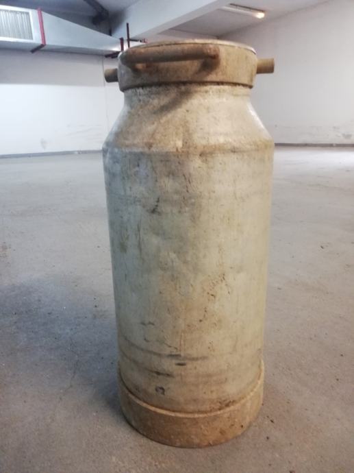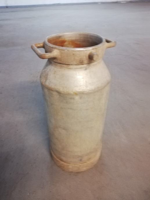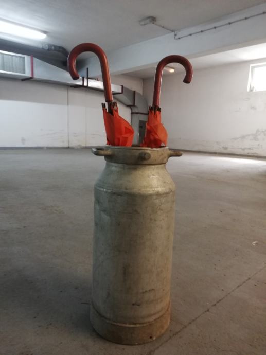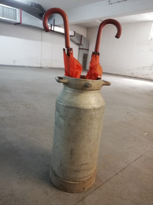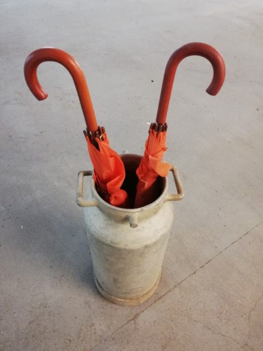 Stara velika posuda od aluminja za mlijeko, sačuvano, za držanje kišobrana.