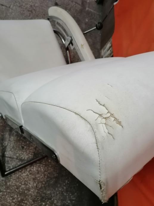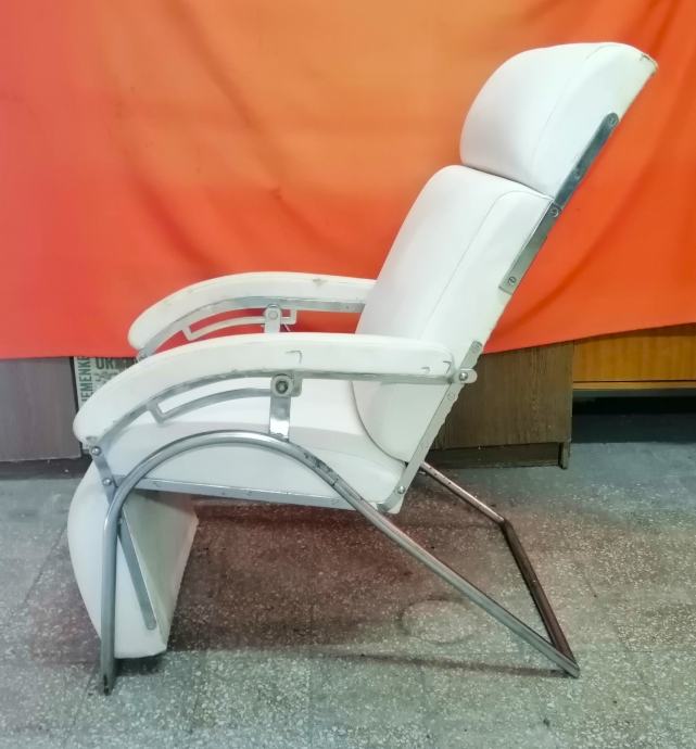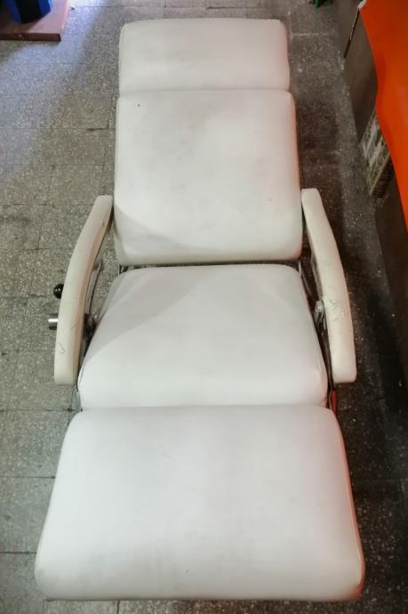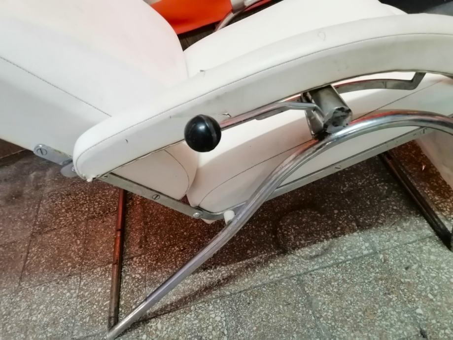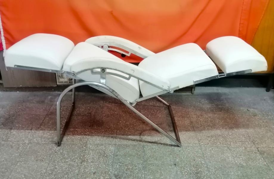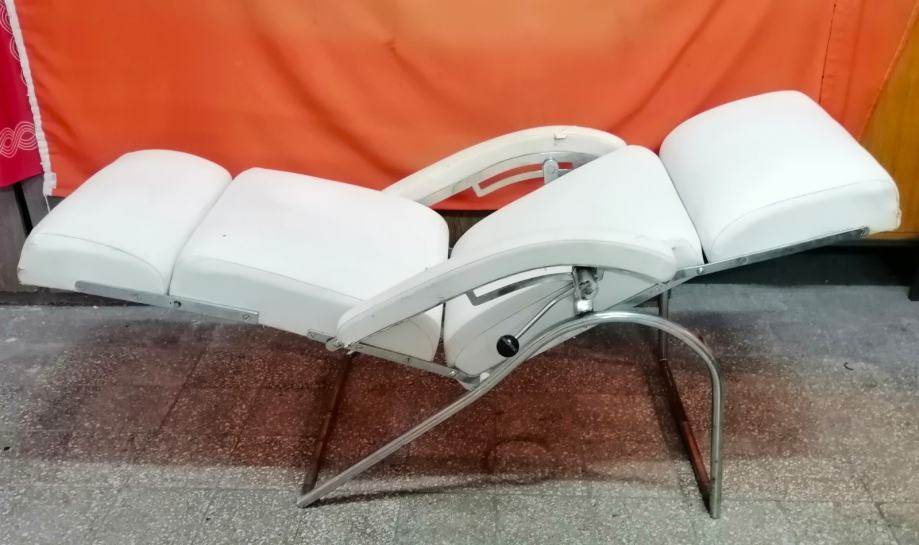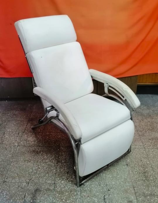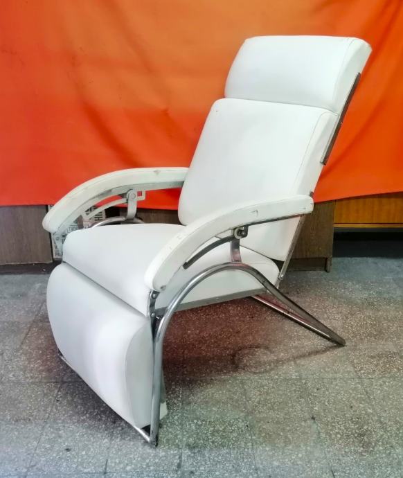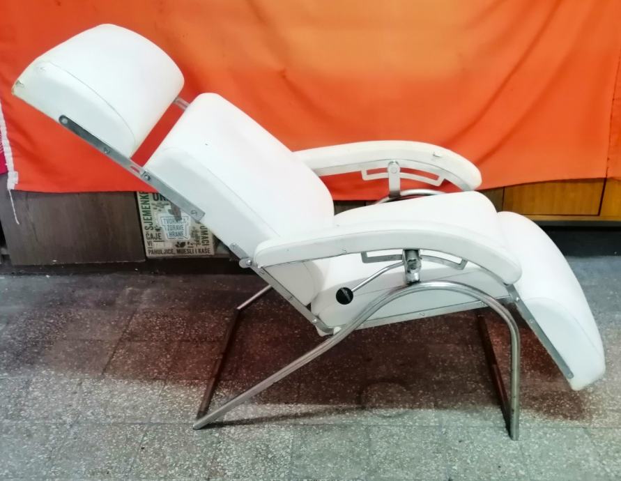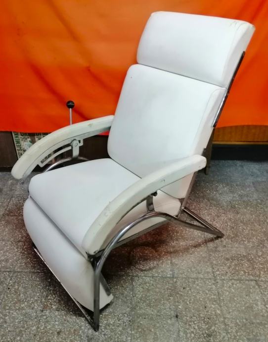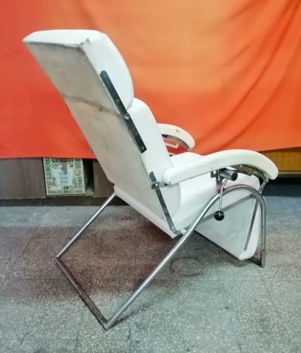 Starina iz vremena kada su pravili stvari da traju veličine 115cm v x 65cm š x 120cm d, čvrsta, niklovana, bijela koža, mehanička ručica za podešavanje visine, kako se stolica obara u ležeči položaj tako se podiže podložak za noge, naslonjač za glavu se ručno dodatno izvlači.