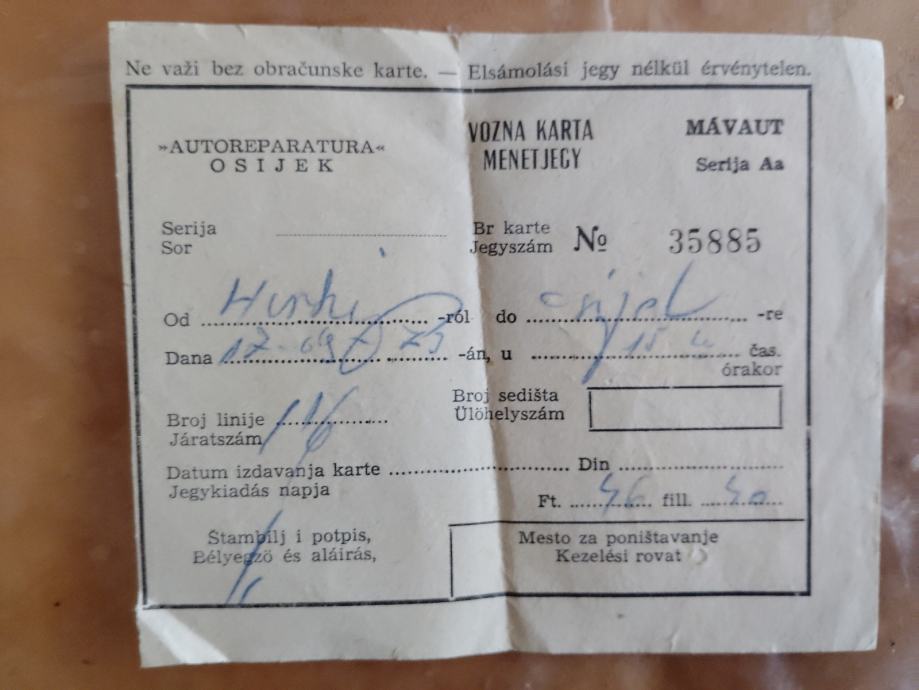 Prodajem staru voznu kartu Harkanj- Osijek iz 1970. godine.