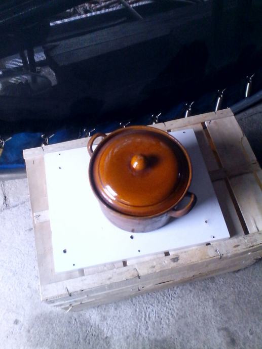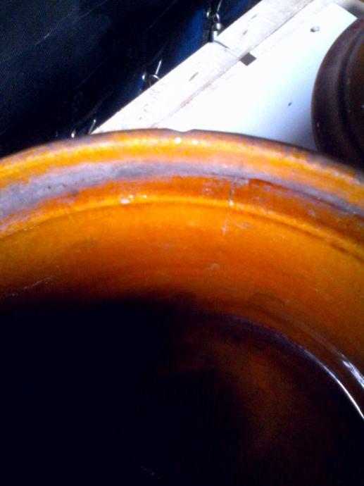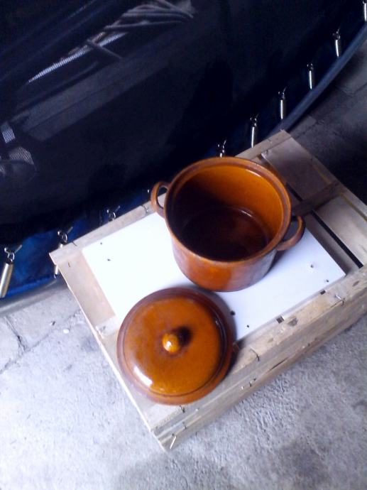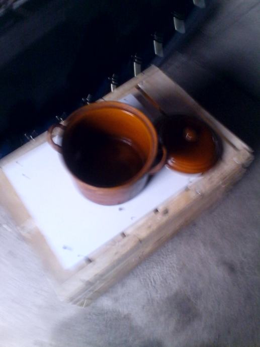 Stara zdjela s originalnim poklopcem od pečene gline. Visina je 15 cm i vanjskog promjera 21 cm. Zdjela ima jedva malo vidljivo napuknuče što se vidi na uvečanoj slici. Cijena je 4 eura .