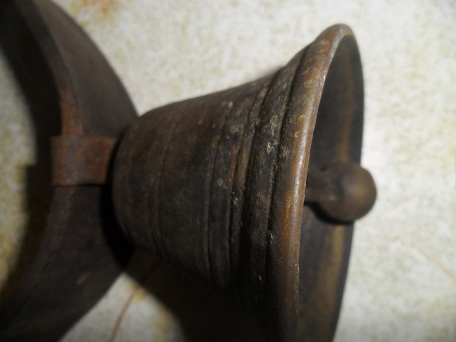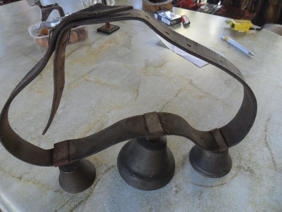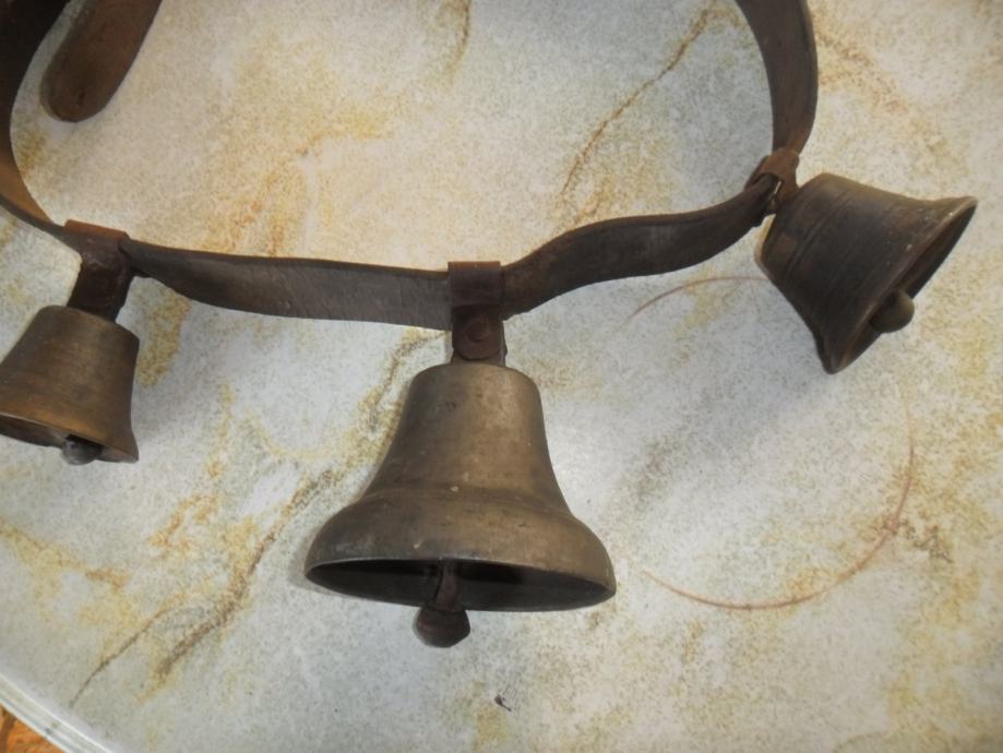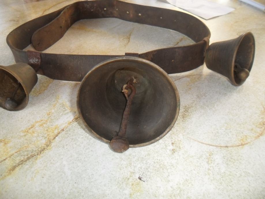 izvrsno stanje zvona,jedino nema kopče na remenu.zvona su originalna i bila su na konju..največe zvono je 11x 11cm(v x promjer dna)druga 2 su identična i malo manja 7,5 x 6,5cm(v x promjer dna),,,,imam još svakakovih zvona i za više podataka o njima pogledajte moje ostale oglase