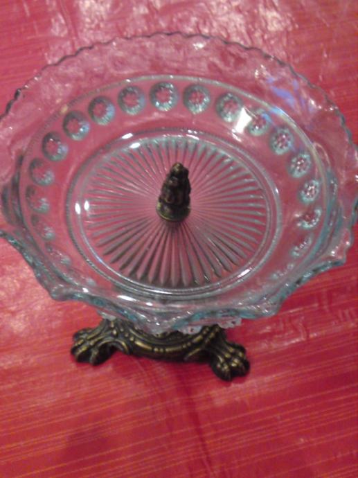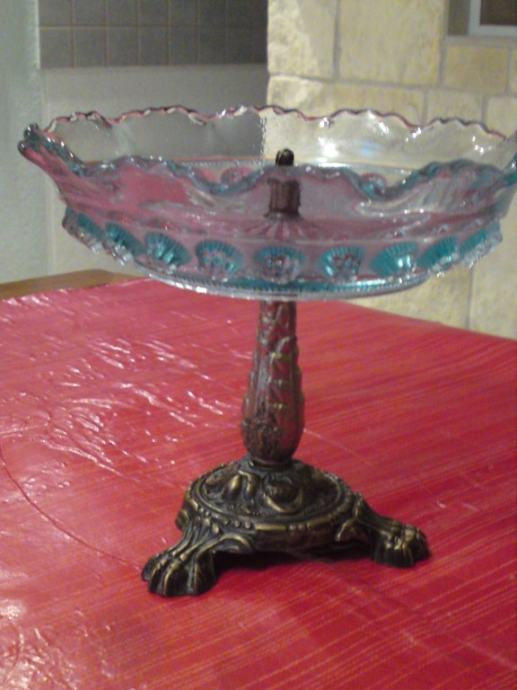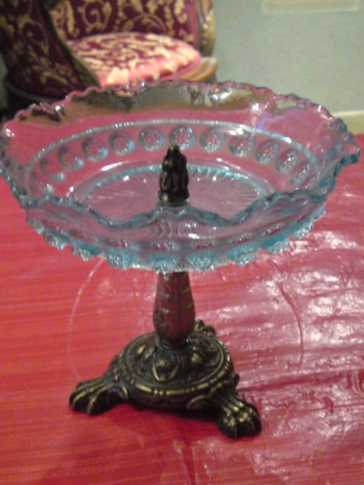 Stara bombonjera; materijal: puni mesing (stopa) + plavo kristalno staklo (pladanj).