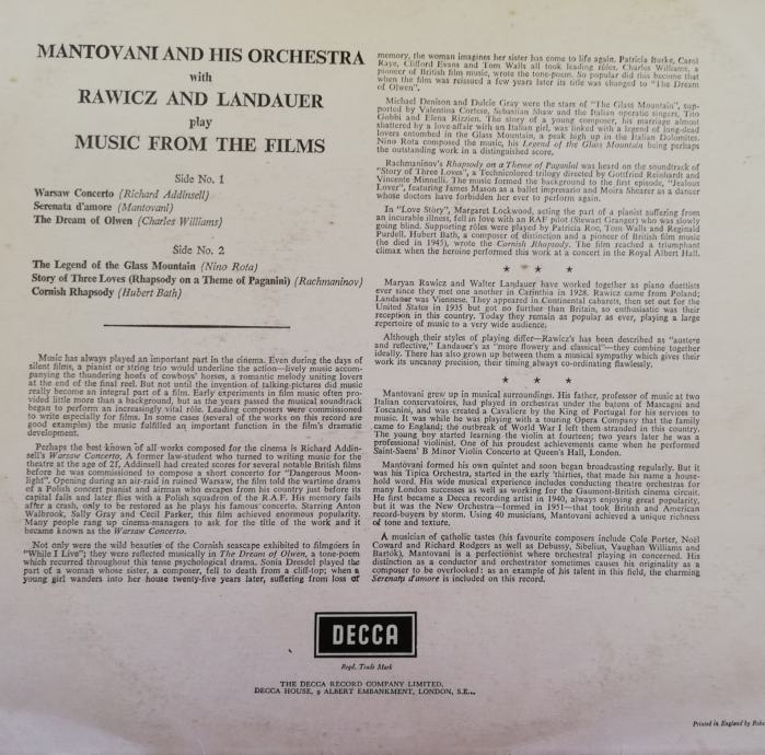 2. Mantovani, Rawicz i Landauer, Izbor filmske glazbe. Stanje: omot 5 / ploča 5