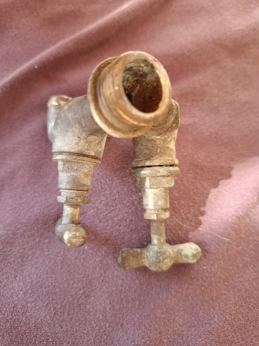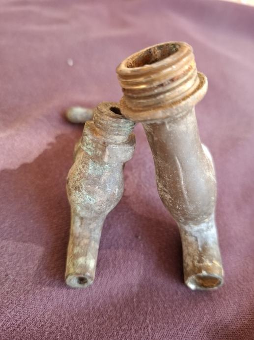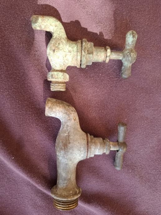 Prodajem starinske mesingane pipe za vodu,male su,za kolekciju ili upotrebu,stanje kao na slici,funkcioniraju ali bi bilo dobro promijeniti gumice(ove na njima su stare),šaljem pouzećem na trošak kupca ili tiskom po prethodnoj uplati,15 eura za obadvije u kompletu