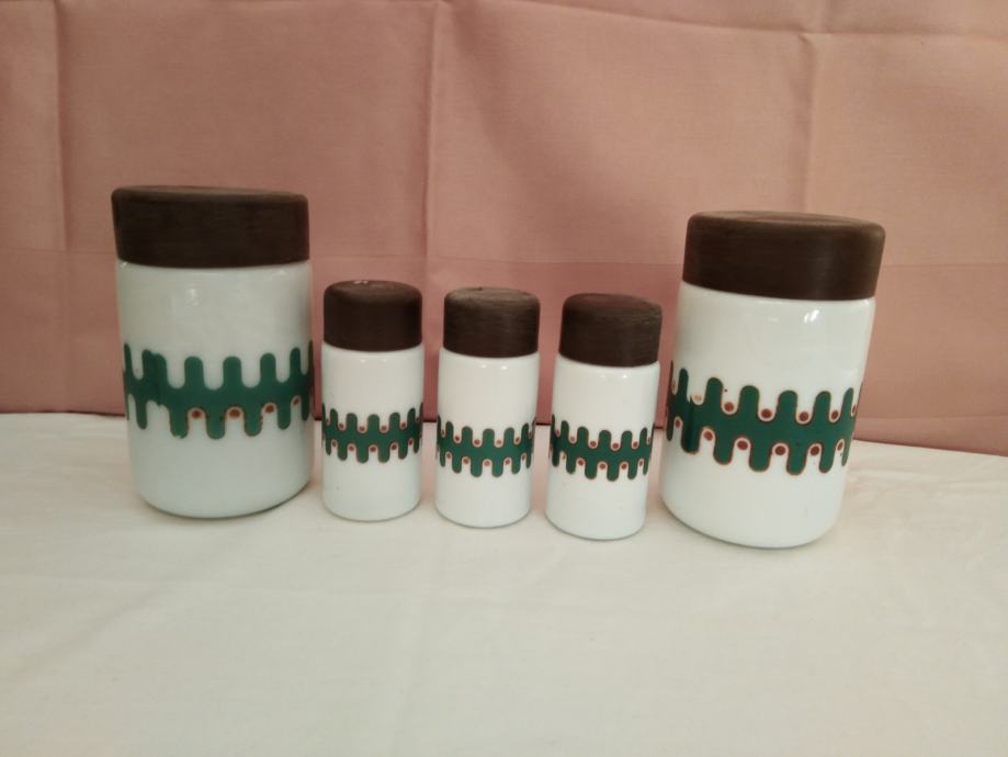 Set 5 posuda sa poklopcima i drvenom policom