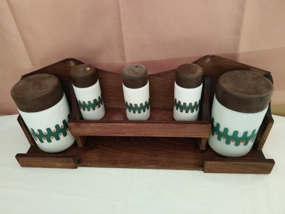 Porculanske posude za začine sa drvenom policom / drvenim stalkom
